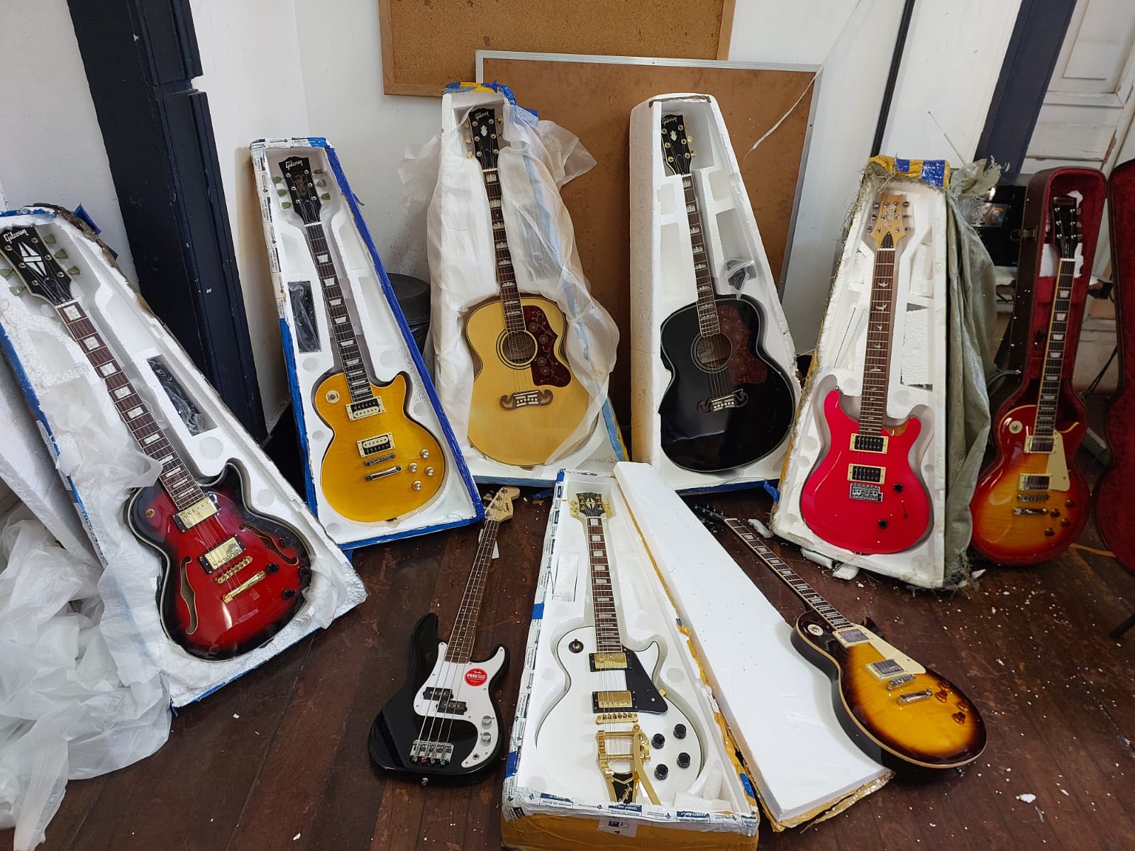 A lista de doações inclui 1 mini baixo. 2 violões, 6 guitarras, 3 pedais para instrumento musical, 1 amplificador, além de 1 equipamento para aferição oftalmológica. “Todos os equipamentos de música são de marca excelente e estão em ótimo estado”, ressaltou o professor Fernando Guilhon. O material foi entregue na unidade da Receita Federal, no Aeroporto do Galeão. "Fomos muito bem recebidos por todos os funcionários, em especial pelos senhores Rafael Pelicarto da Silva e Cosme Viana da Rocha, agentes de carga, que nos deram todo o apoio necessário", destacou a assessora Ana Maria Nóbrega.