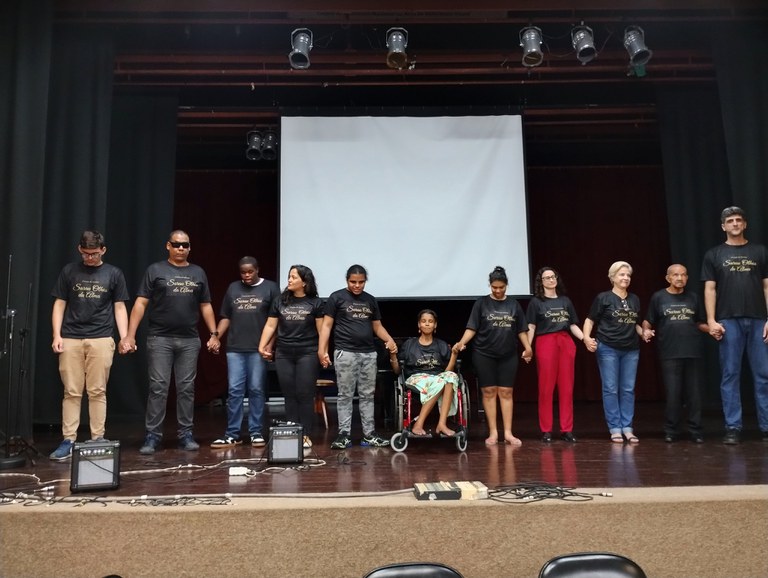 Foto: Participantes do Sarau Olhos na Alma no palco cumprimentam a plateia