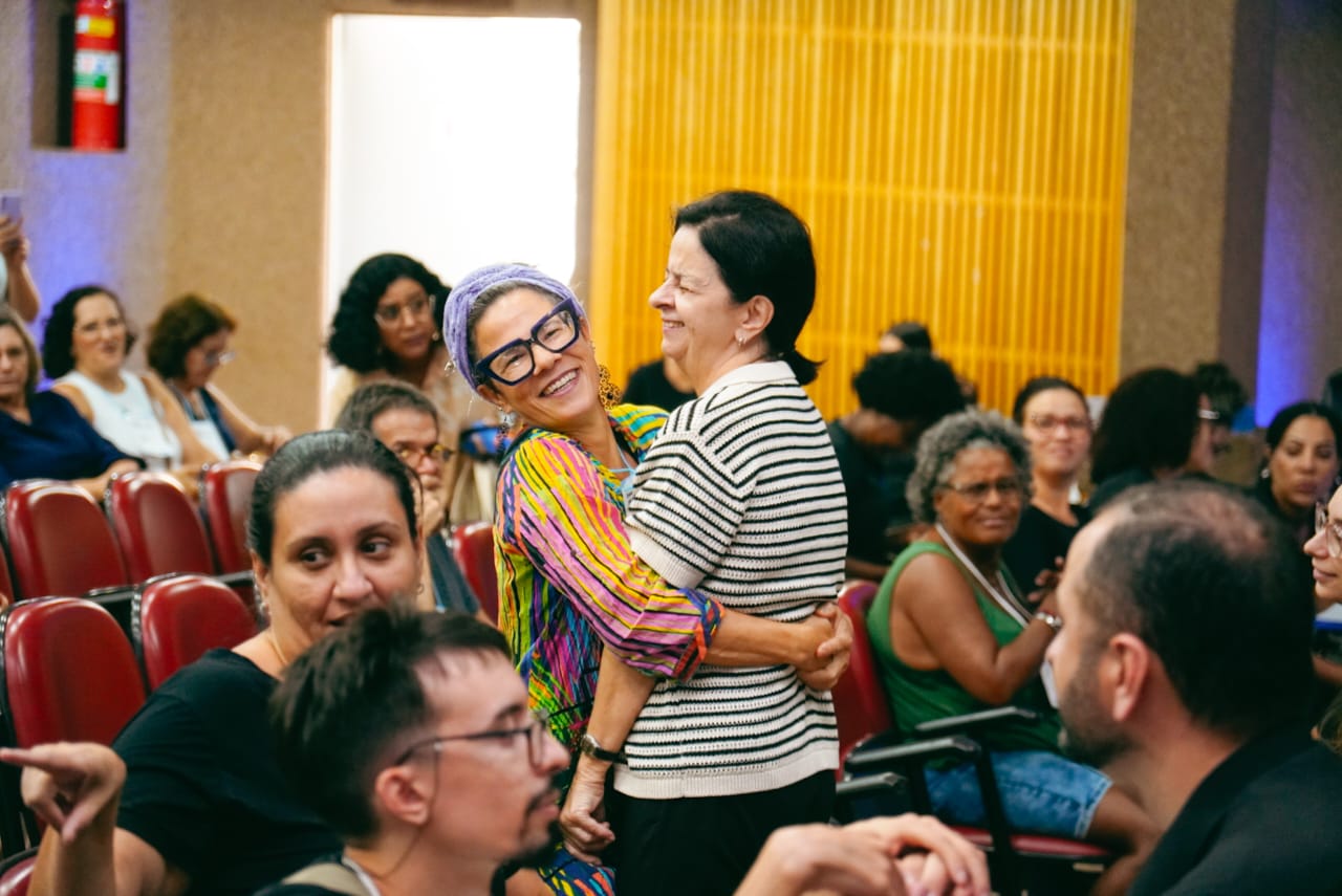 Foto na plateia do Teatro Benjamin Constant, pessoa surdocega, vestindo rosa, acompanha a palestra com auxílio de intérprete em Libras, vestindo preto.