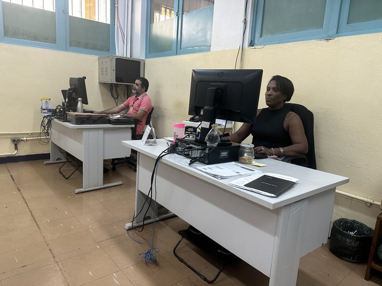 Foto do setor de Divisão de Material e Patrimônio com duas pessoas sentadas em estações de trabalho