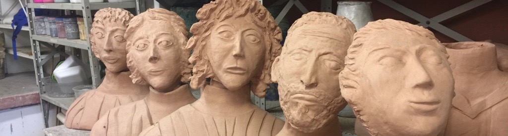 Série de bustos esculpidos em argila enfileirados