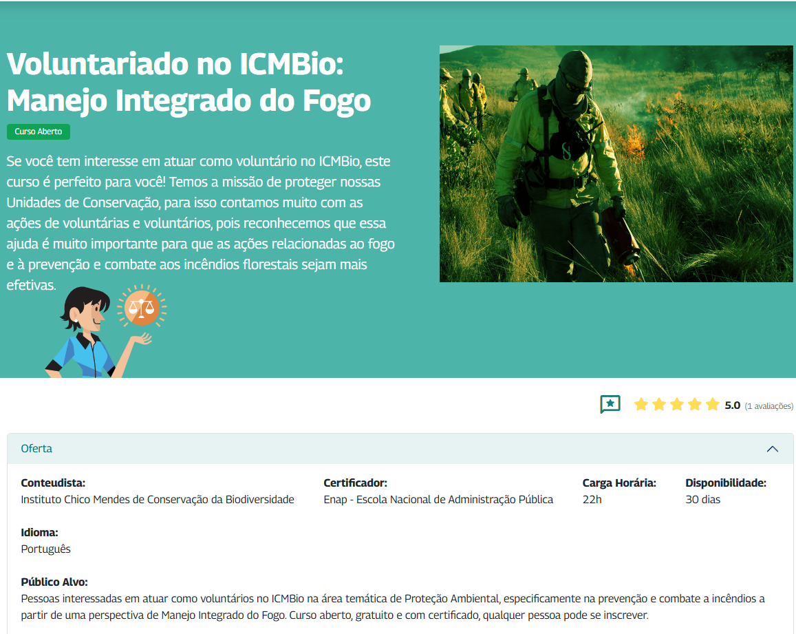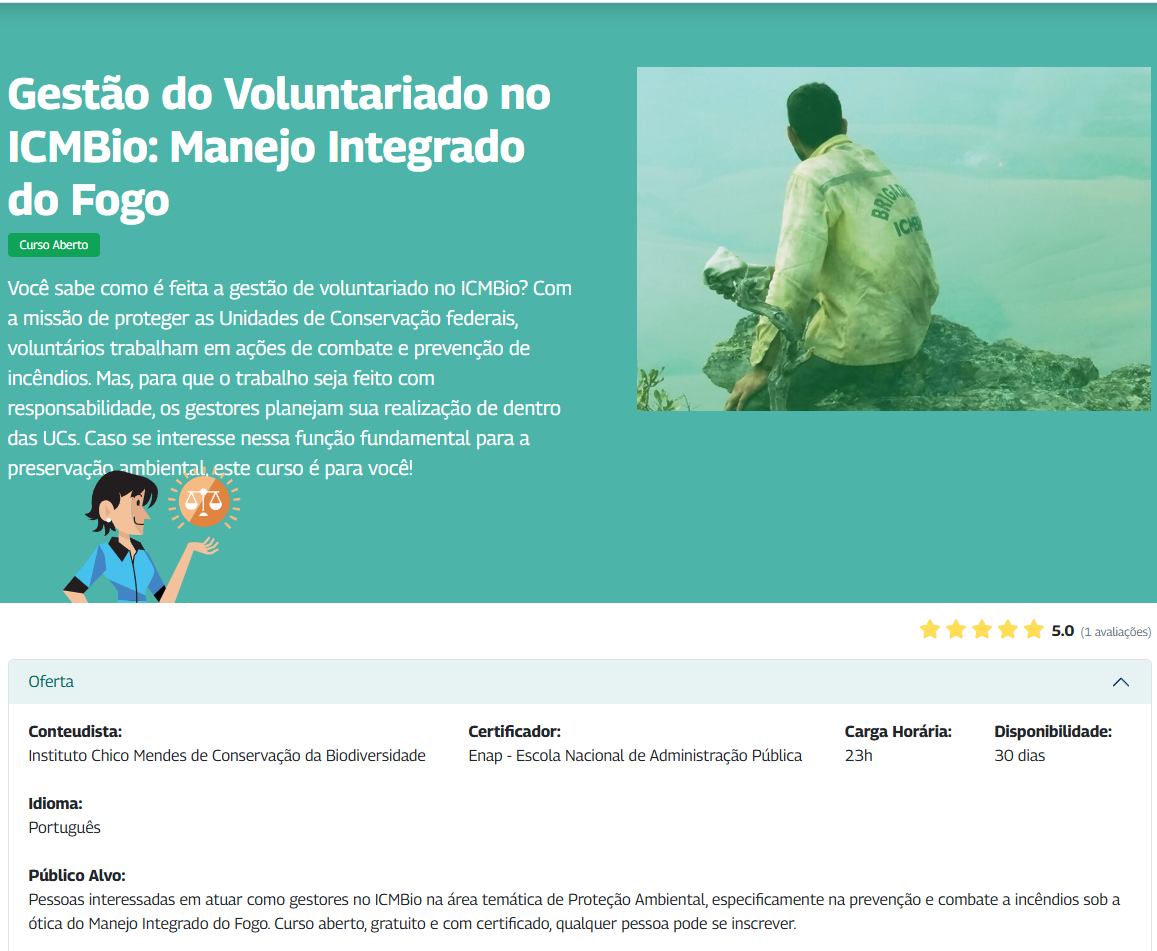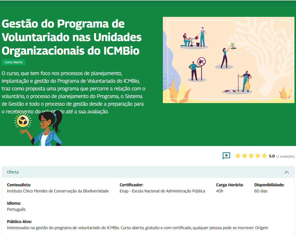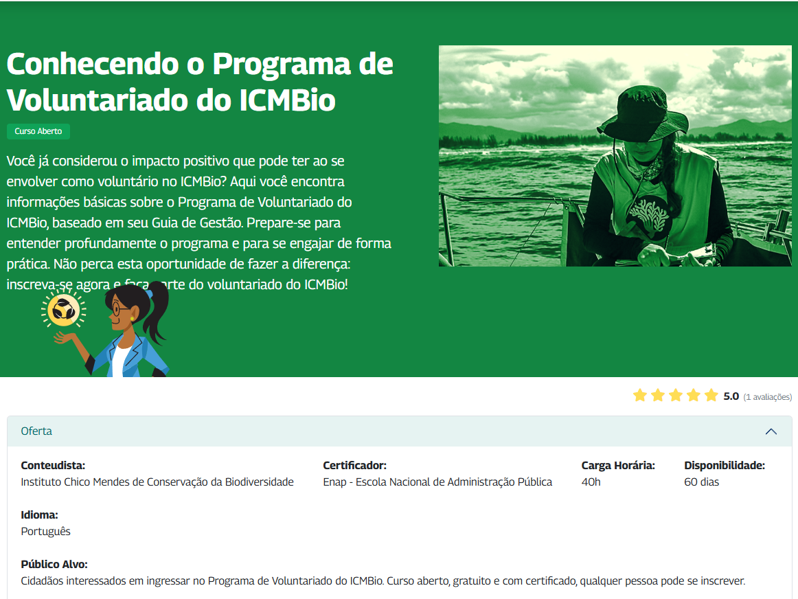 Conheça mais sobre o Programa de Voluntariado do ICMBio realizando os cursos gratuitos disponibilizados na Escola Virtual de Governo, desenvolvidos pelo ICMBio em parceria com a ENAP.