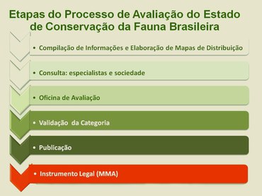 O processo constou de uma compilação inicial sobre as informações relevantes existentes na literatura e elaboração de mapa de distribuição geográfica para cada espécie, seguida por uma consulta dos especialistas, seja de forma direta, através de envio de mensagens e convite para contribuição ou de forma indireta, disponibilizando aqui no site do ICMBio, a relação das espécies que estavam sob avaliação e formulários para envio de contribuições. Com essas informações consolidadas, foram organizadas oficinas de trabalhos com a presença de um grupo representativo de especialistas, momento em que cada espécie teve a categoria de risco de extinção definida, com justificativa.