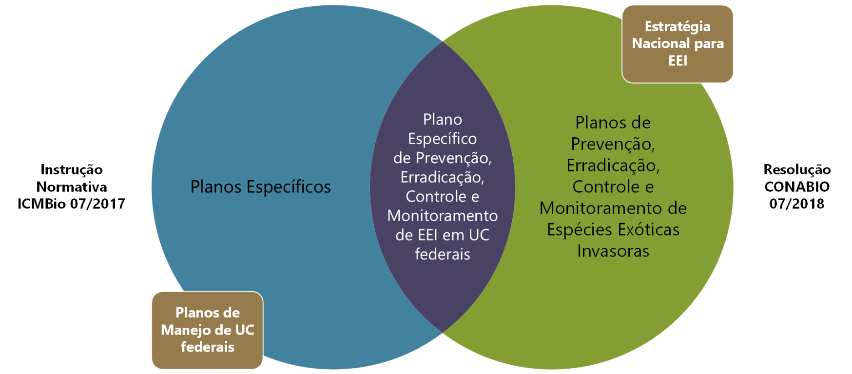 Planos específicos são documentos técnicos de planejamento que, contemplam estratégias e ações que orientam a gestão e o manejo de áreas temáticas da UC. Estes instrumentos são previstos na IN ICMBio 07/2017, como ferramentas complementares ao plano de manejo das UC federais. Além disso, Planos de prevenção, erradicação, controle e monitoramento são instrumentos de implementação da Estratégia Nacional para Espécies Exóticas Invasoras (Resolução CONABIO 07/2018). |