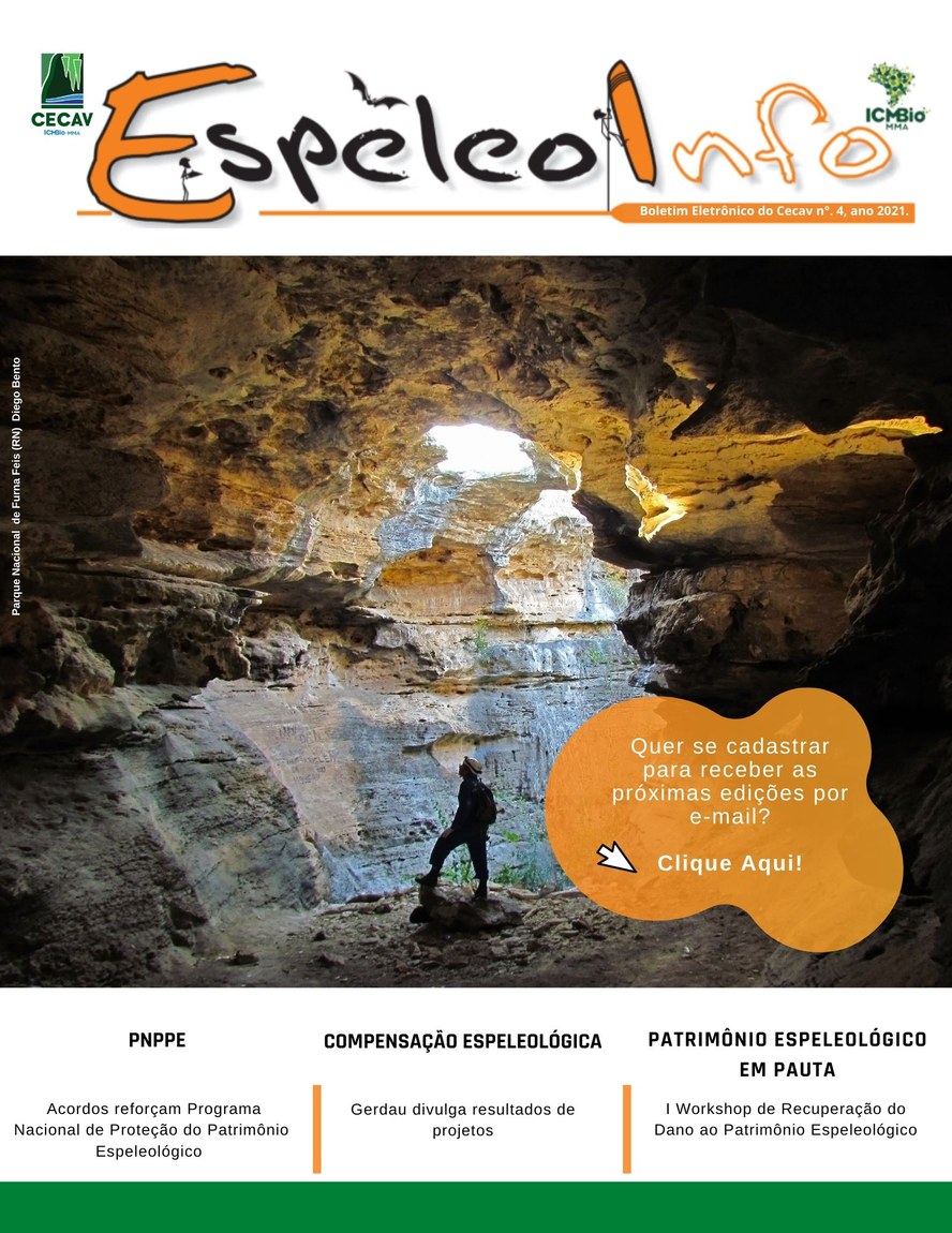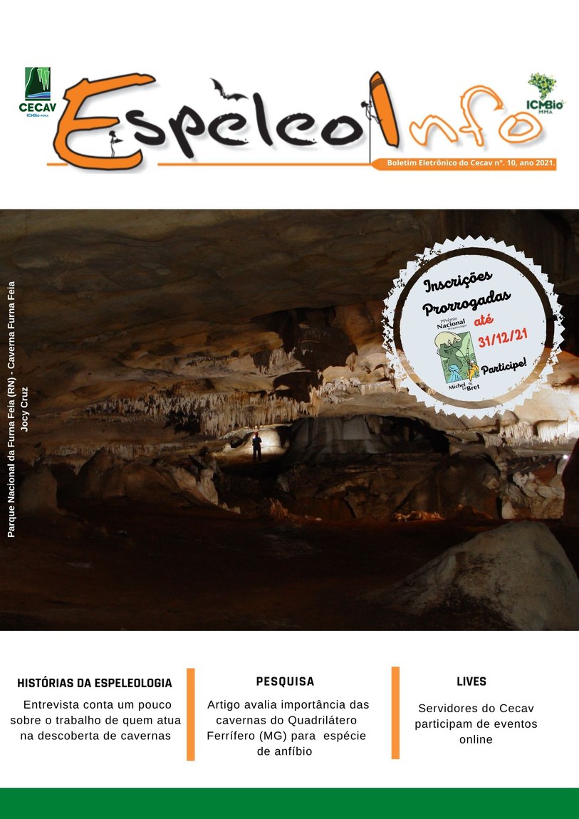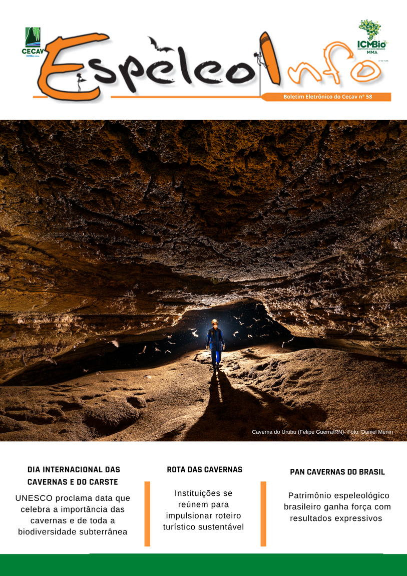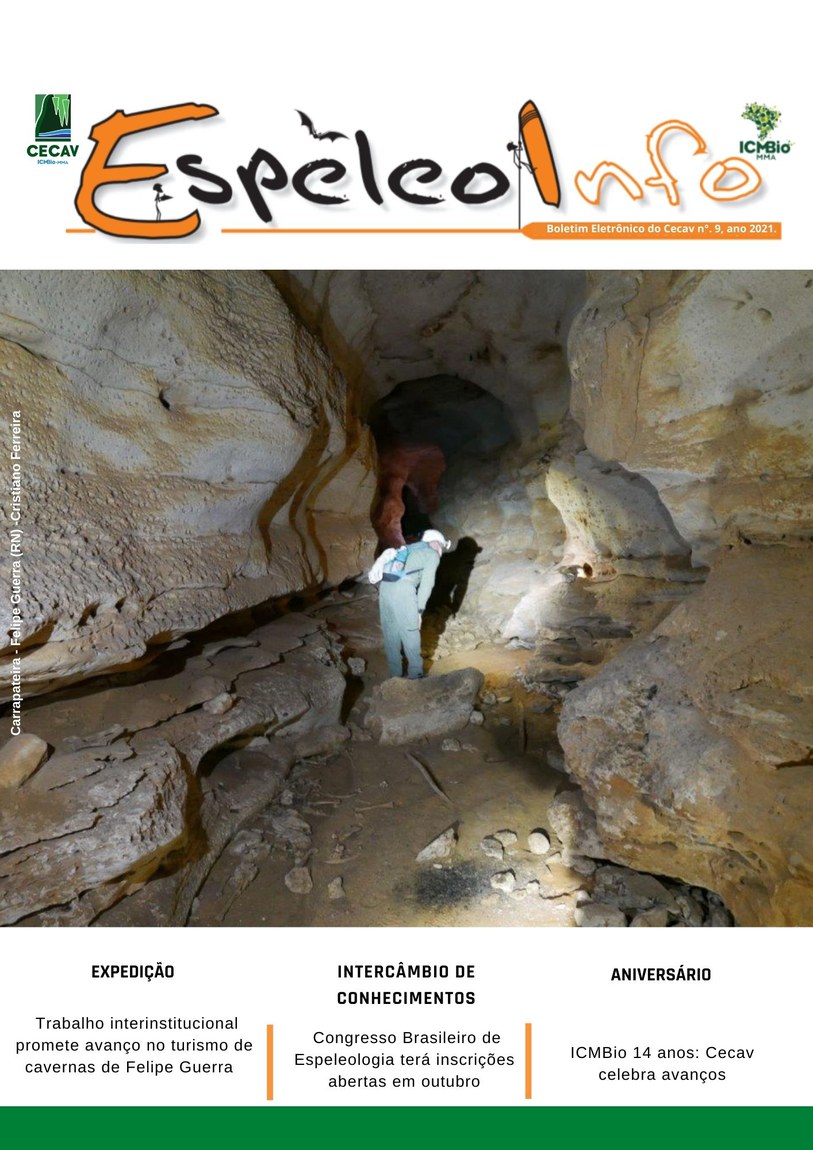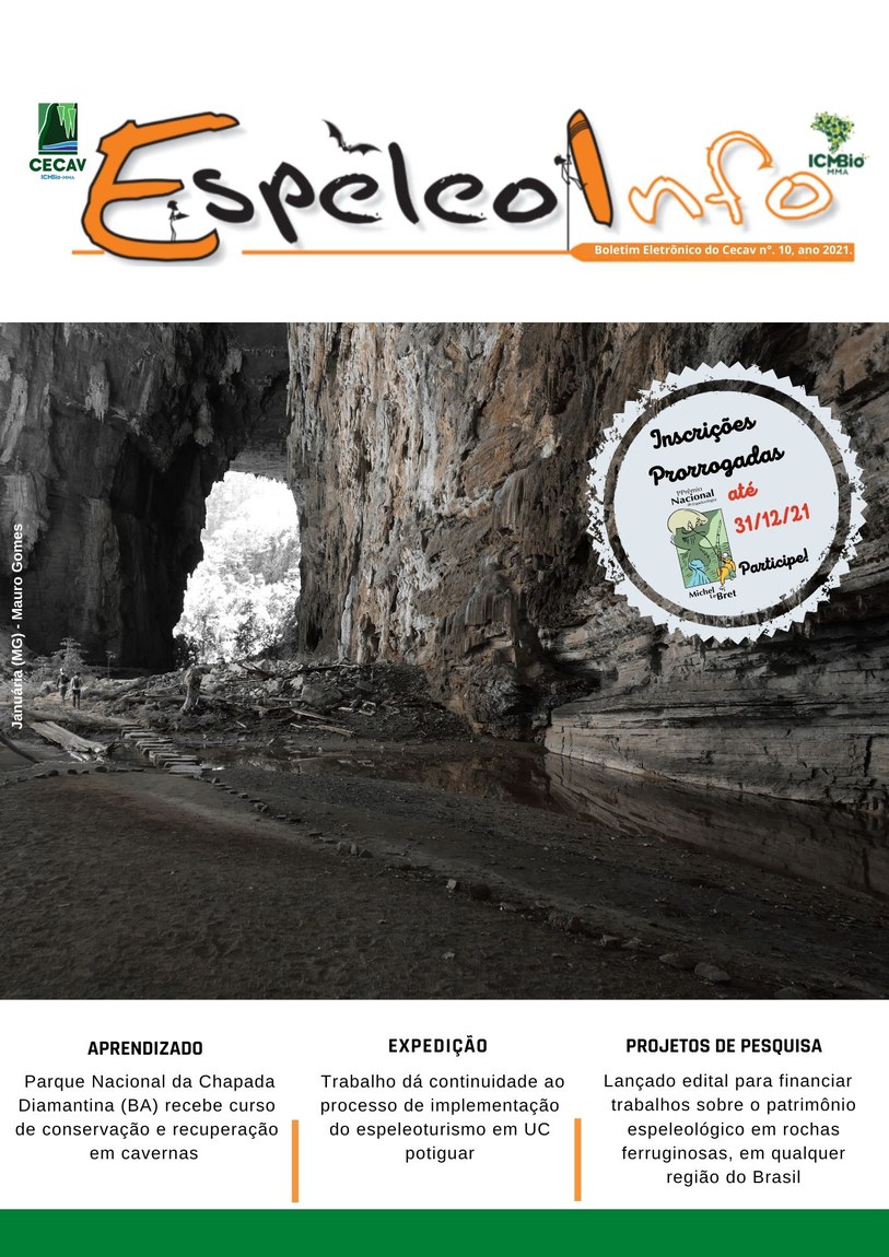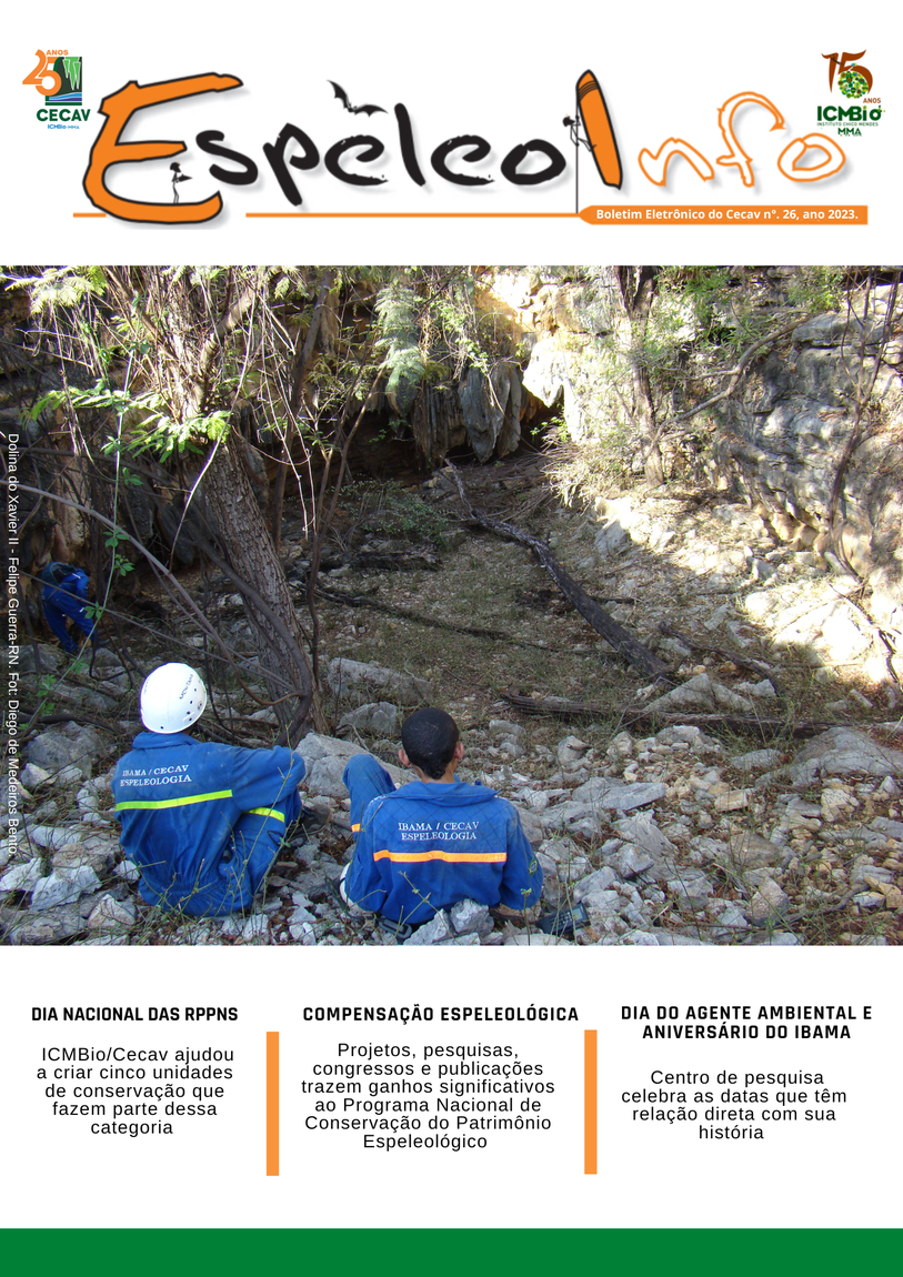 O Centro Nacional de Pesquisa e Conservação de Cavernas (Cecav/ICMBio) está relançando a EspeleoInfo, uma revista digital que tem como objetivo ampliar a divulgação e transparência das atividades do Cecav. O material é direcionado a pesquisadores, estudantes, grupos de espeleologia, espeleólogos e pessoas relacionadas à agenda de proteção e conservação de cavidades naturais subterrâneas. Nesse veículo de publicação mensal, serão divulgadas pesquisas, editais, chamadas de projetos, cursos, eventos e outras atividades relativos à missão institucional do Cecav. Os parceiros e colaboradores estão convidados a compartilhar este espaço.