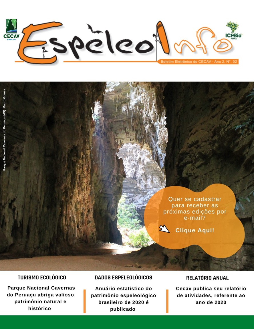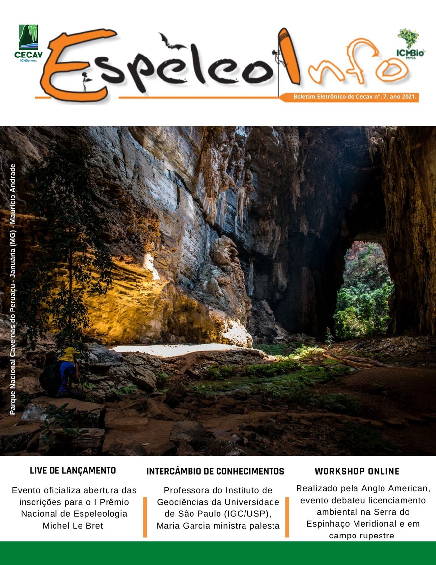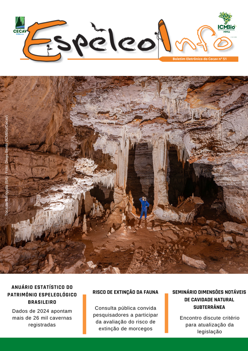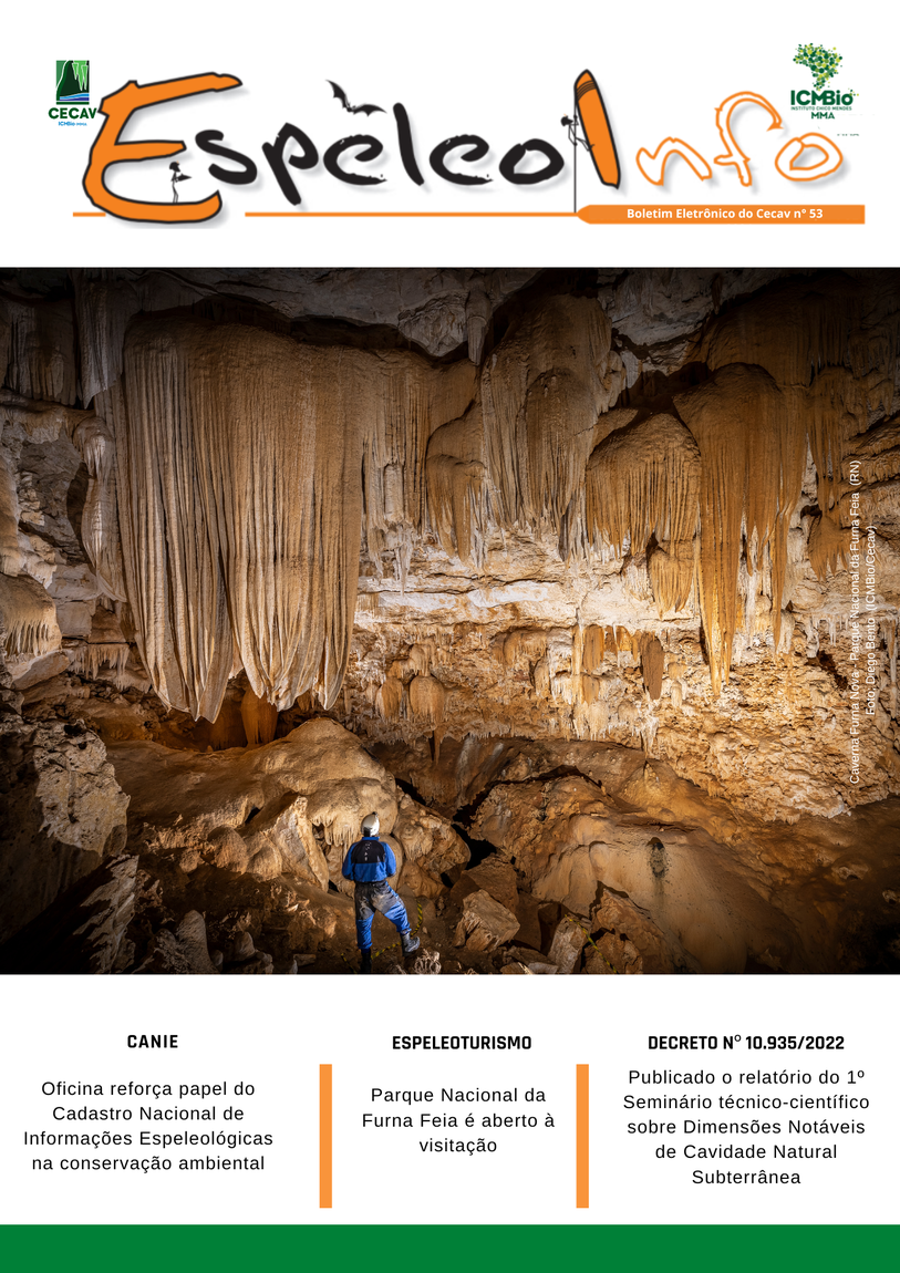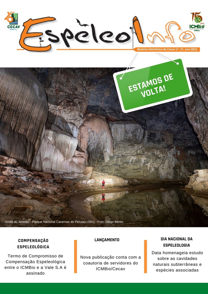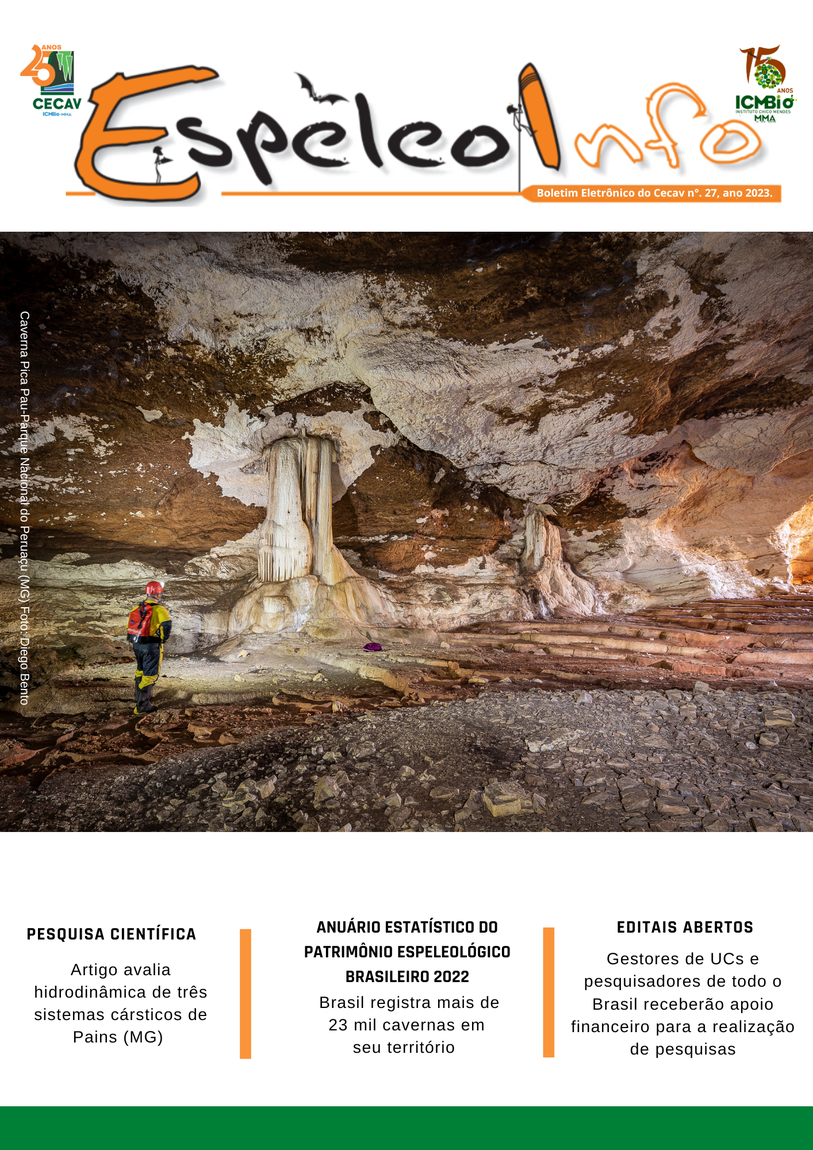 O Centro Nacional de Pesquisa e Conservação de Cavernas (Cecav/ICMBio) está relançando a EspeleoInfo, uma revista digital que tem como objetivo ampliar a divulgação e transparência das atividades do Cecav. O material é direcionado a pesquisadores, estudantes, grupos de espeleologia, espeleólogos e pessoas relacionadas à agenda de proteção e conservação de cavidades naturais subterrâneas. Nesse veículo de publicação mensal, serão divulgadas pesquisas, editais, chamadas de projetos, cursos, eventos e outras atividades relativos à missão institucional do Cecav. Os parceiros e colaboradores estão convidados a compartilhar este espaço.