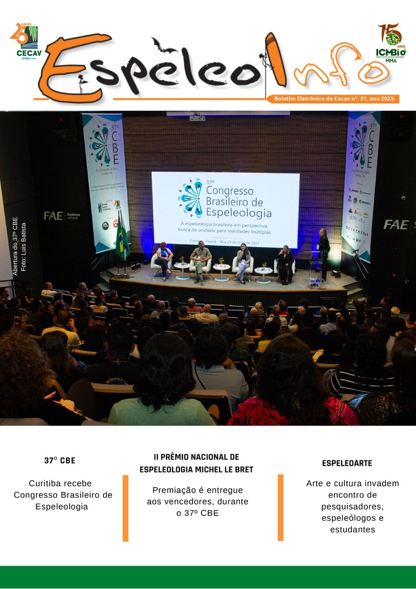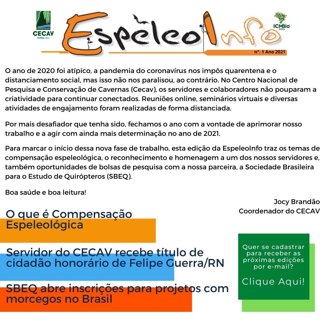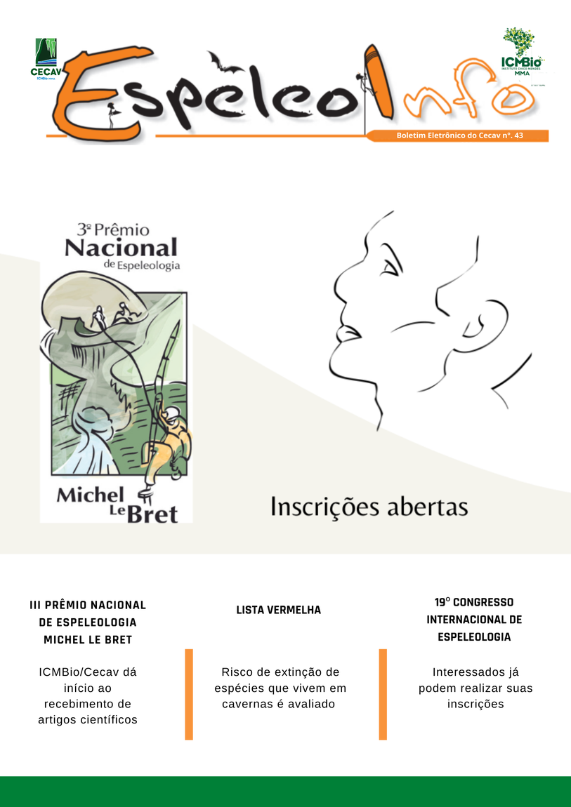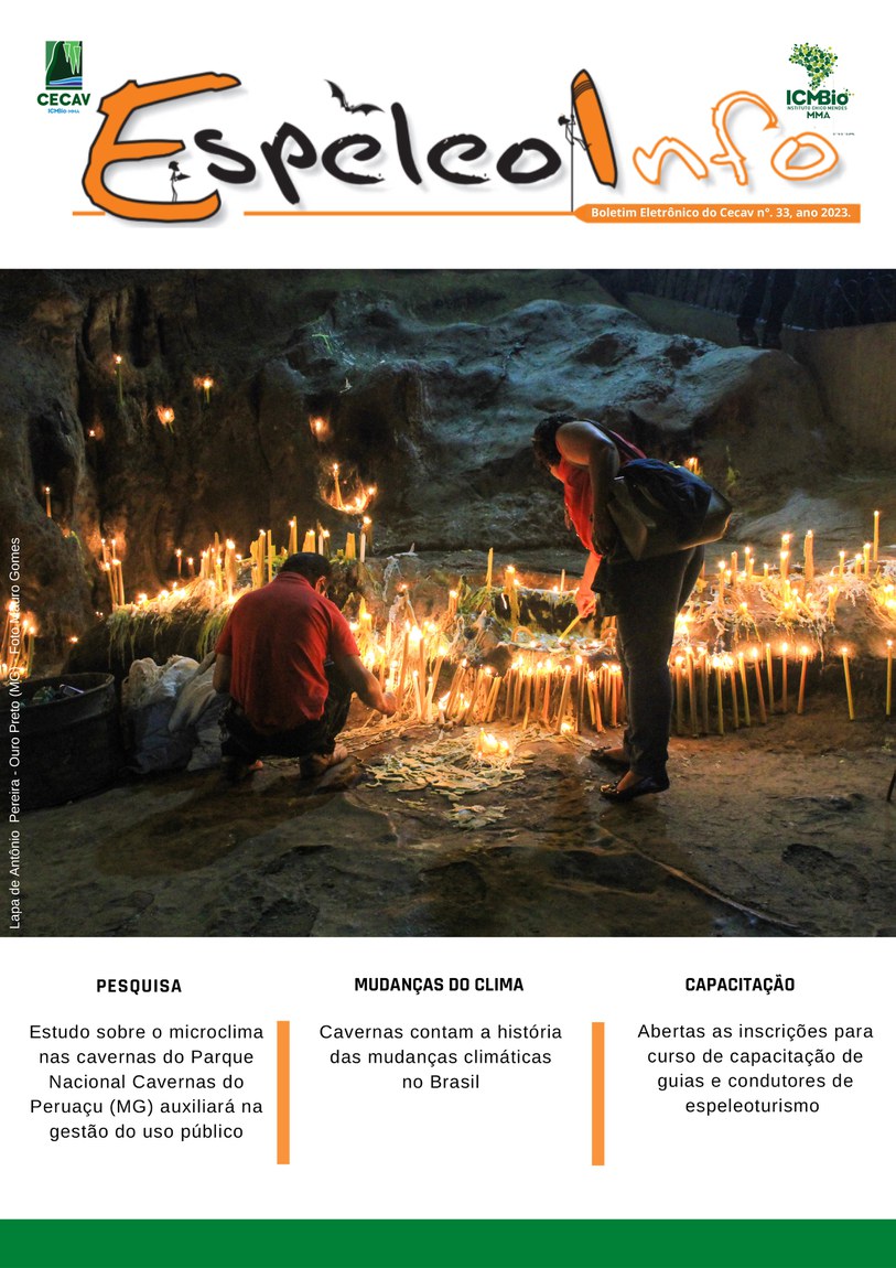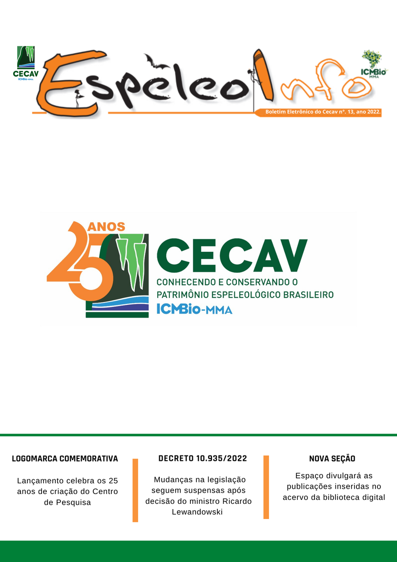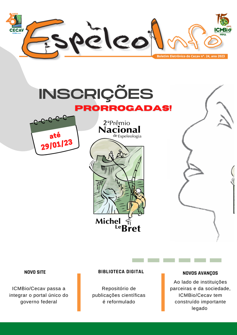 O Centro Nacional de Pesquisa e Conservação de Cavernas (Cecav/ICMBio) está relançando a EspeleoInfo, uma revista digital que tem como objetivo ampliar a divulgação e transparência das atividades do Cecav. O material é direcionado a pesquisadores, estudantes, grupos de espeleologia, espeleólogos e pessoas relacionadas à agenda de proteção e conservação de cavidades naturais subterrâneas. Nesse veículo de publicação mensal, serão divulgadas pesquisas, editais, chamadas de projetos, cursos, eventos e outras atividades relativos à missão institucional do Cecav. Os parceiros e colaboradores estão convidados a compartilhar este espaço.