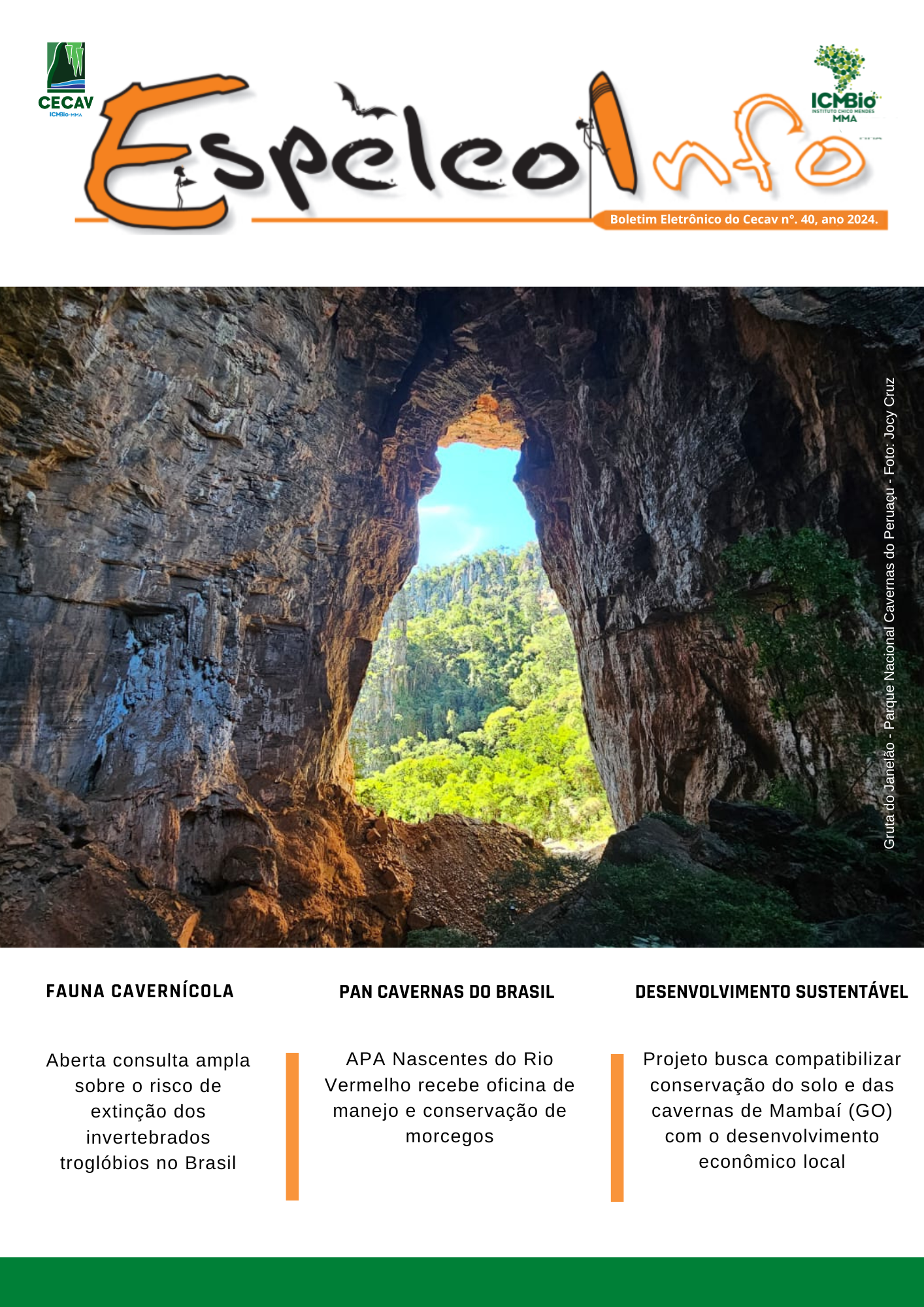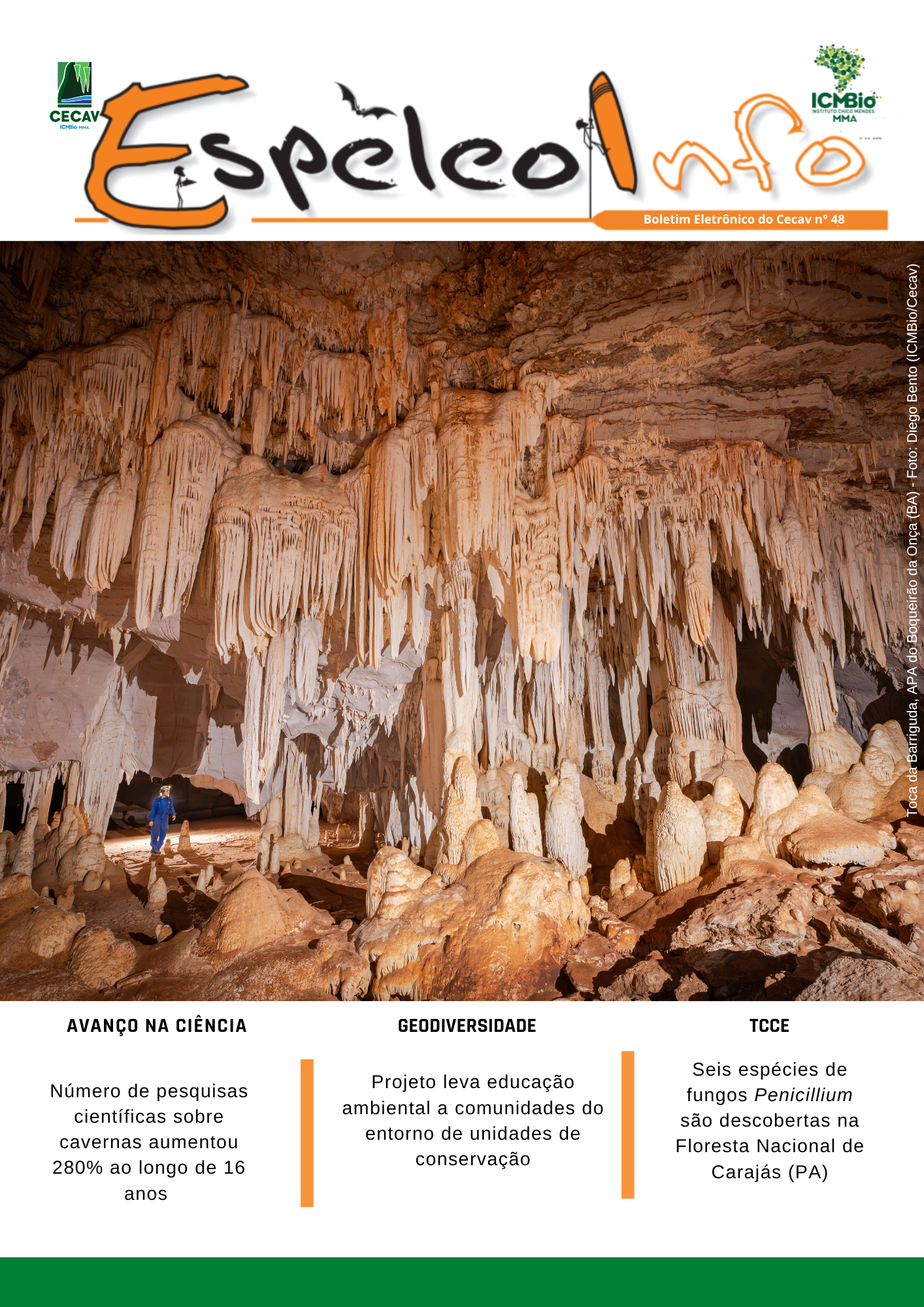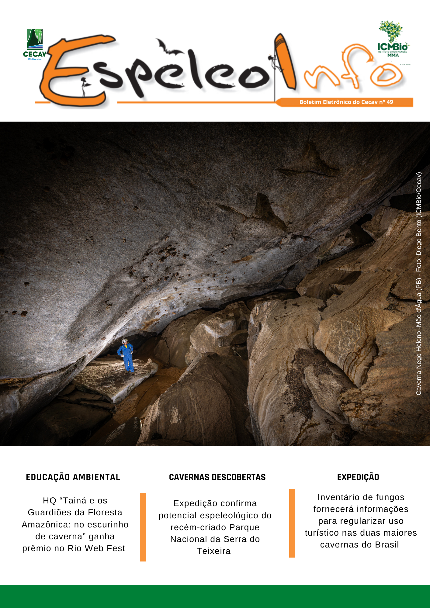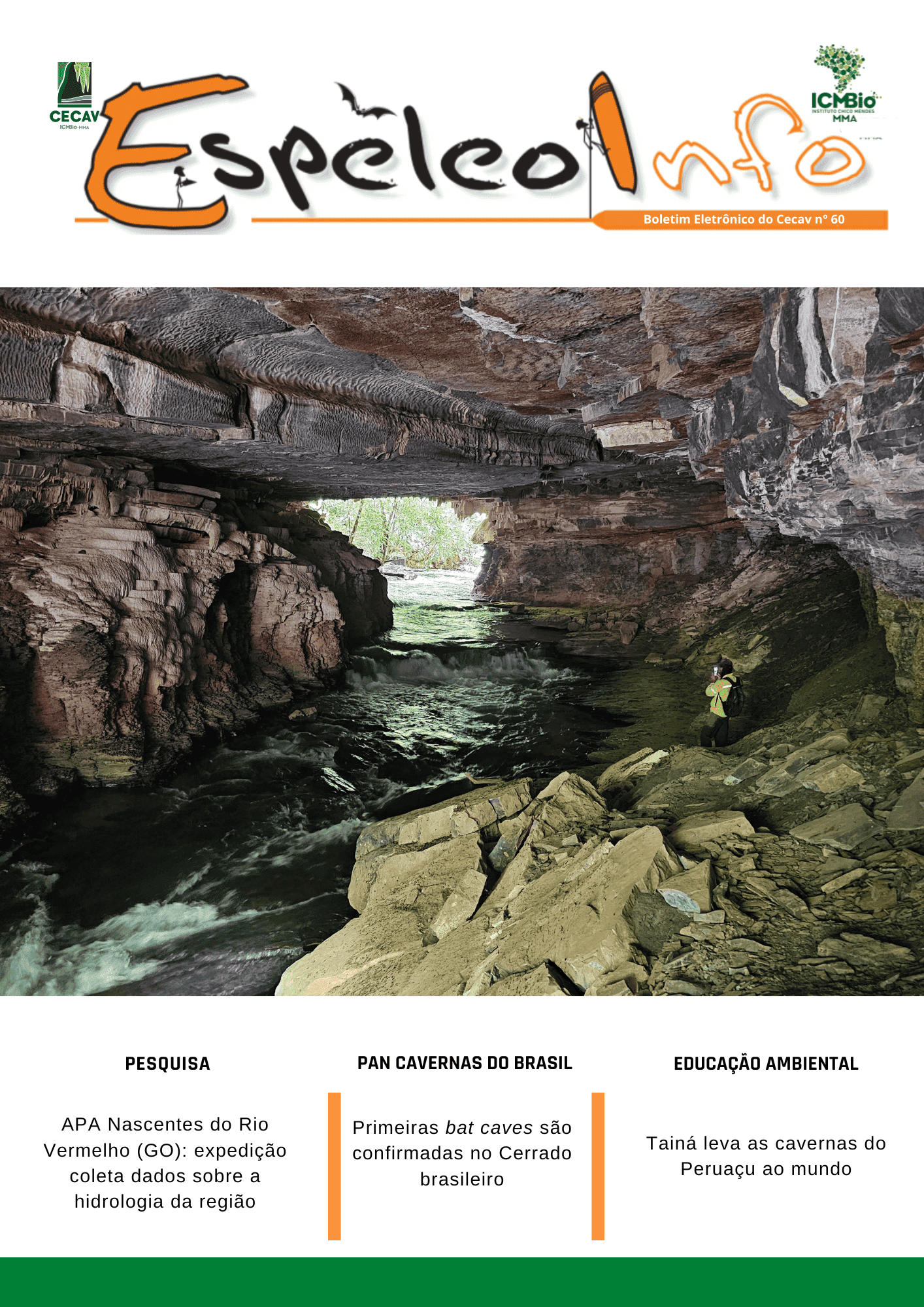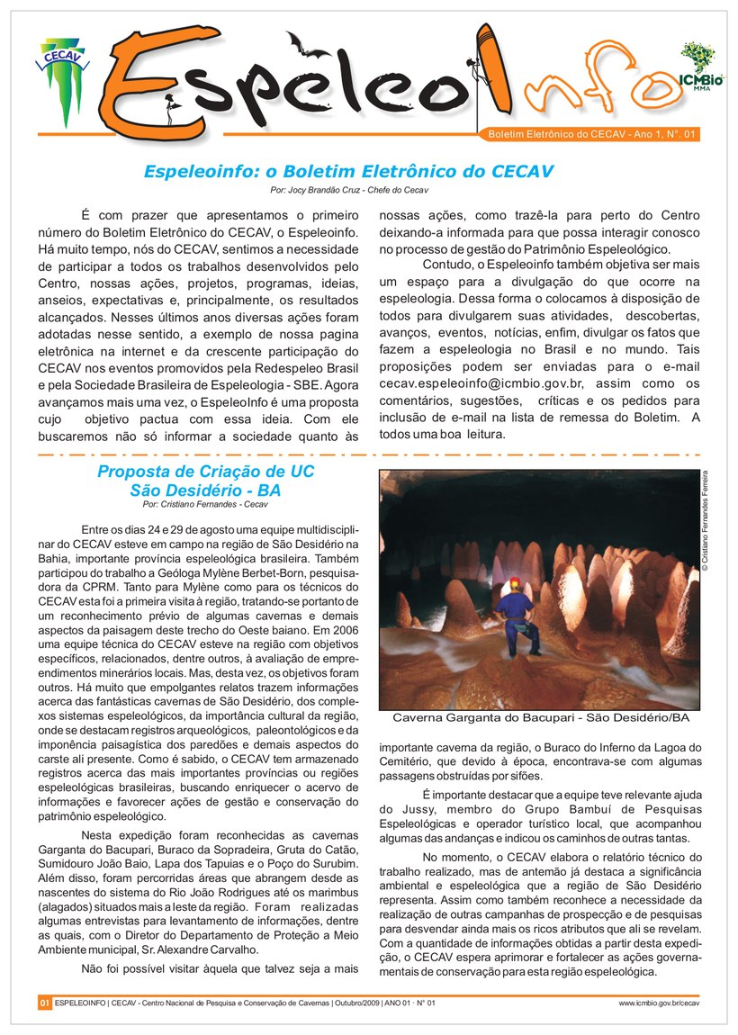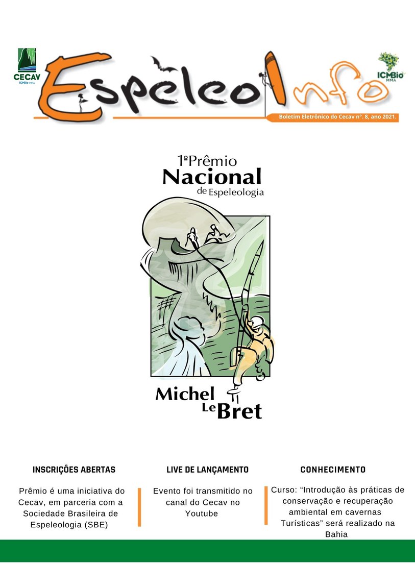 O Centro Nacional de Pesquisa e Conservação de Cavernas (Cecav/ICMBio) está relançando a EspeleoInfo, uma revista digital que tem como objetivo ampliar a divulgação e transparência das atividades do Cecav. O material é direcionado a pesquisadores, estudantes, grupos de espeleologia, espeleólogos e pessoas relacionadas à agenda de proteção e conservação de cavidades naturais subterrâneas. Nesse veículo de publicação mensal, serão divulgadas pesquisas, editais, chamadas de projetos, cursos, eventos e outras atividades relativos à missão institucional do Cecav. Os parceiros e colaboradores estão convidados a compartilhar este espaço.
