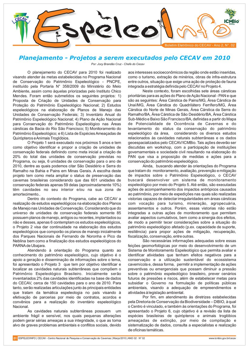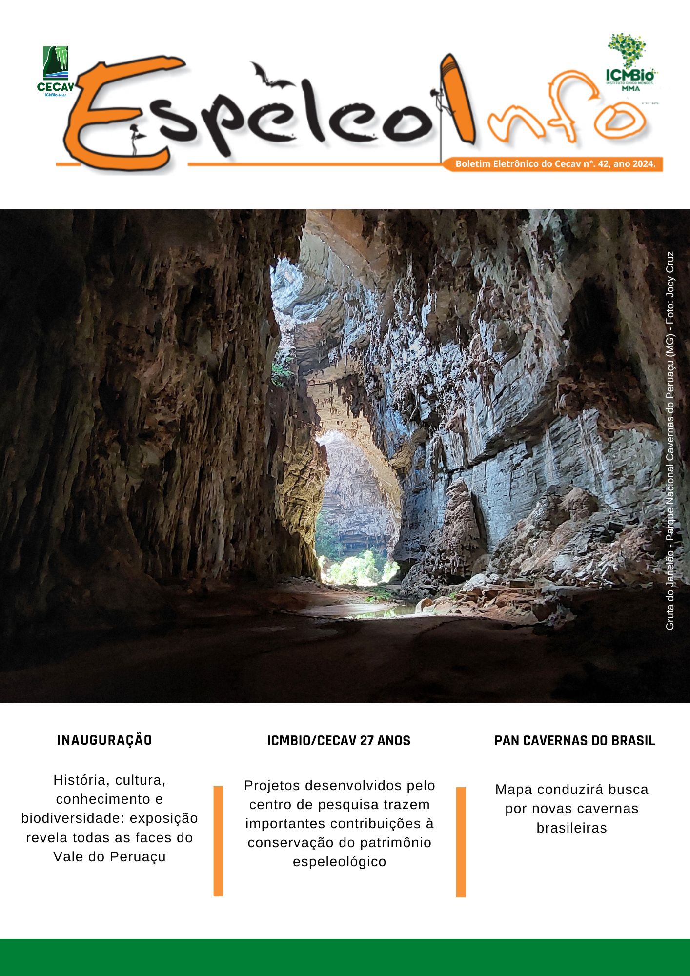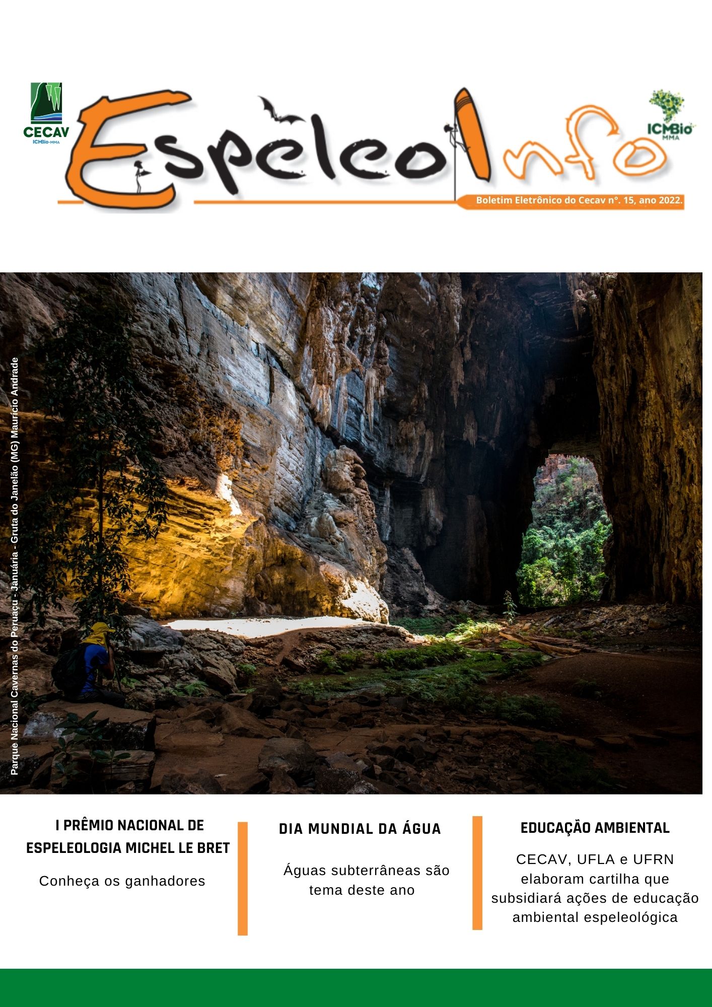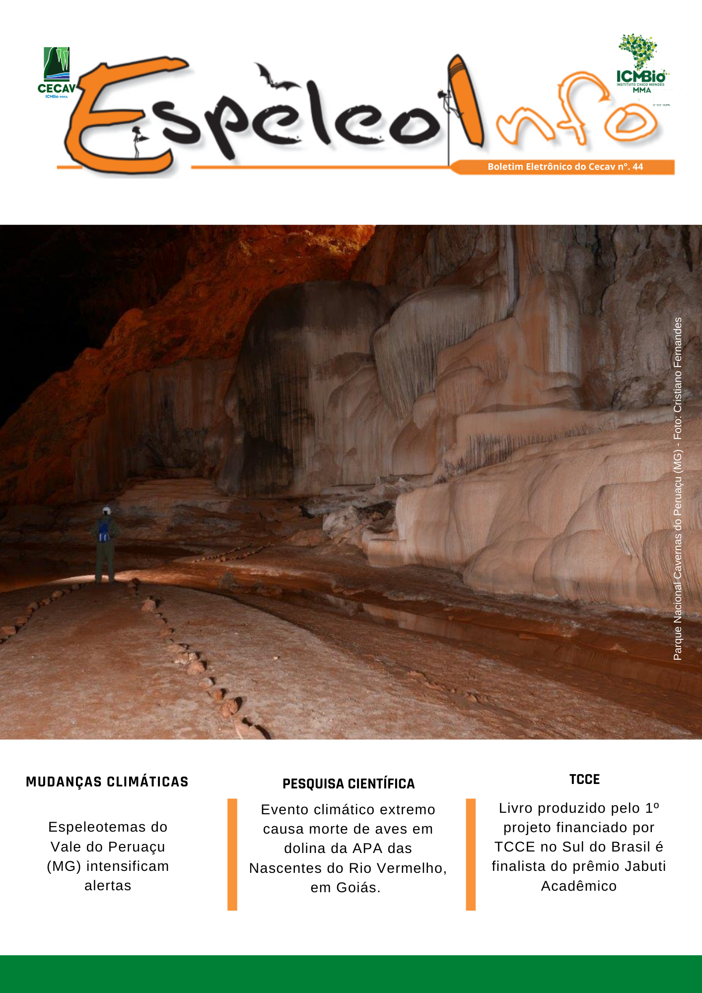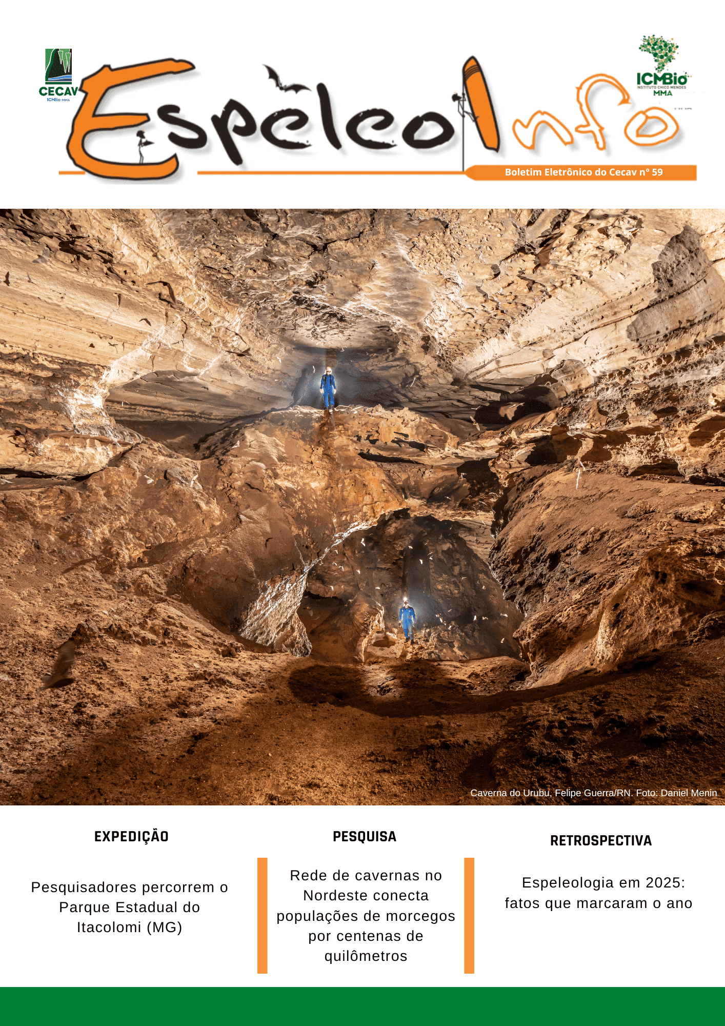 O Centro Nacional de Pesquisa e Conservação de Cavernas (Cecav/ICMBio) está relançando a EspeleoInfo, uma revista digital que tem como objetivo ampliar a divulgação e transparência das atividades do Cecav. O material é direcionado a pesquisadores, estudantes, grupos de espeleologia, espeleólogos e pessoas relacionadas à agenda de proteção e conservação de cavidades naturais subterrâneas. Nesse veículo de publicação mensal, serão divulgadas pesquisas, editais, chamadas de projetos, cursos, eventos e outras atividades relativos à missão institucional do Cecav. Os parceiros e colaboradores estão convidados a compartilhar este espaço.
