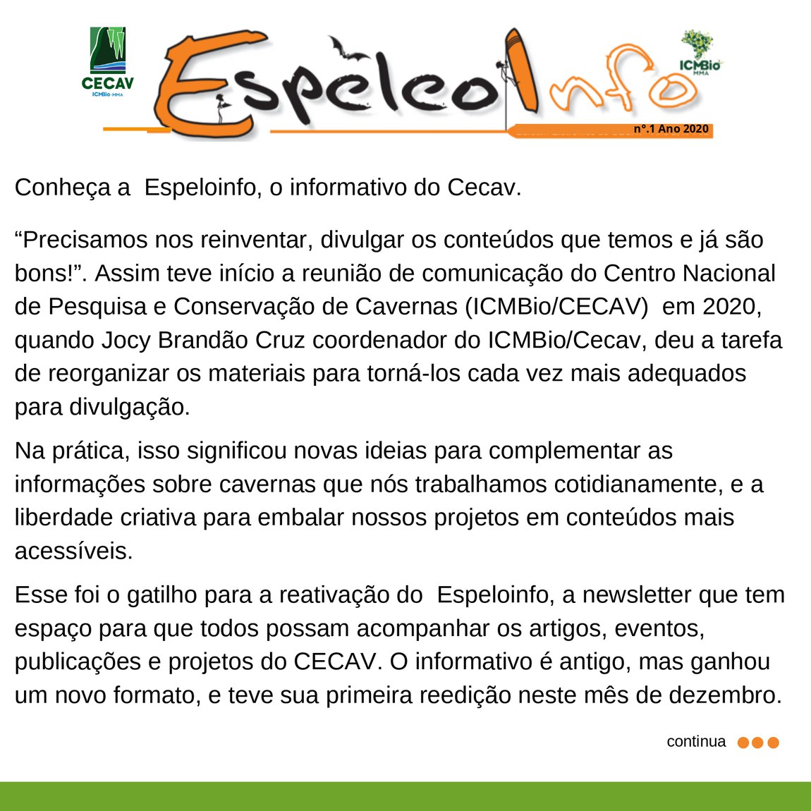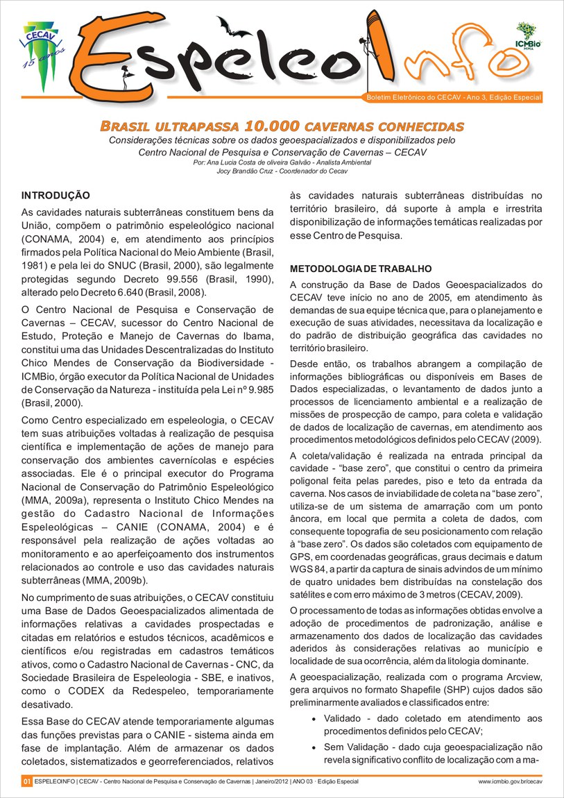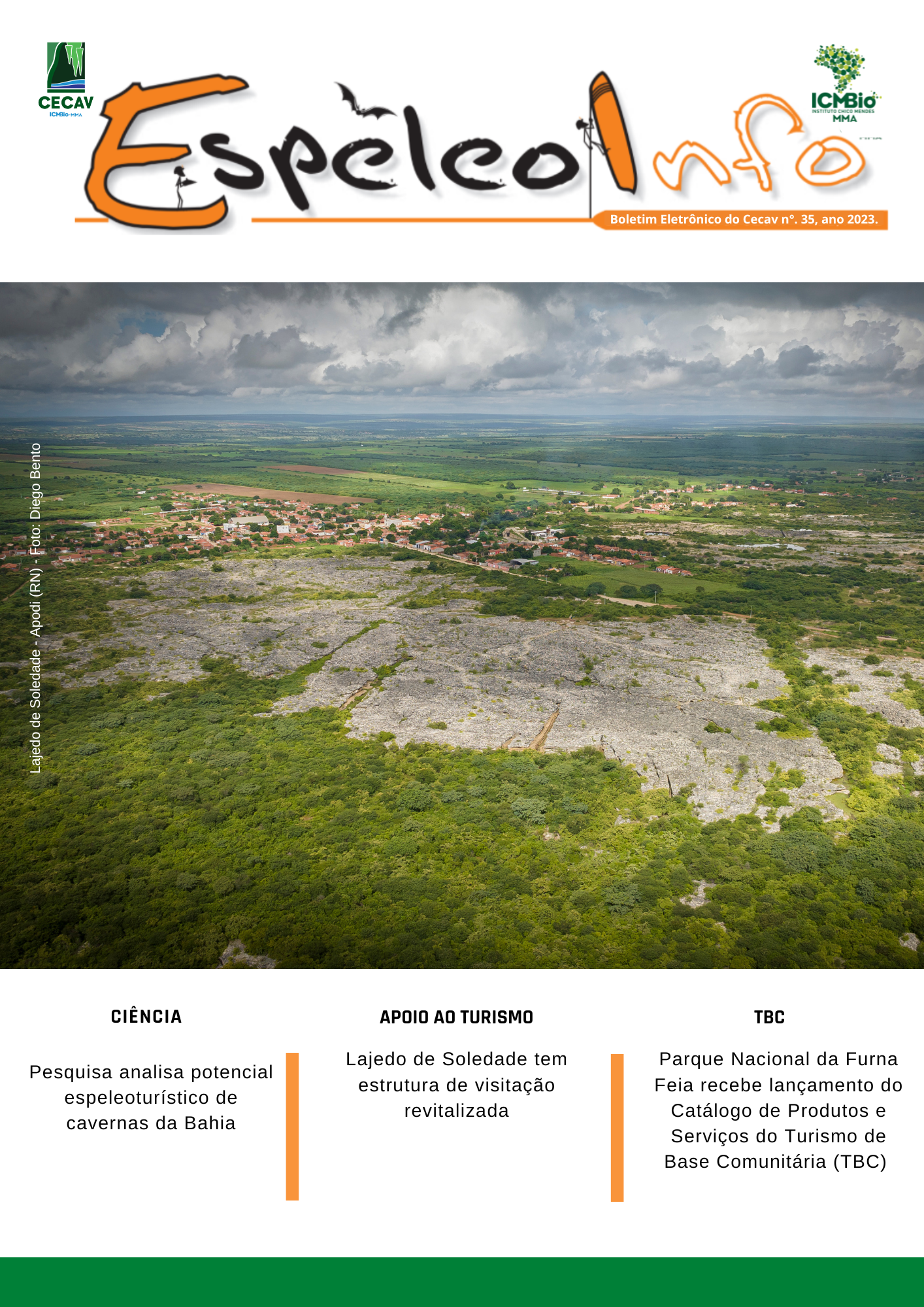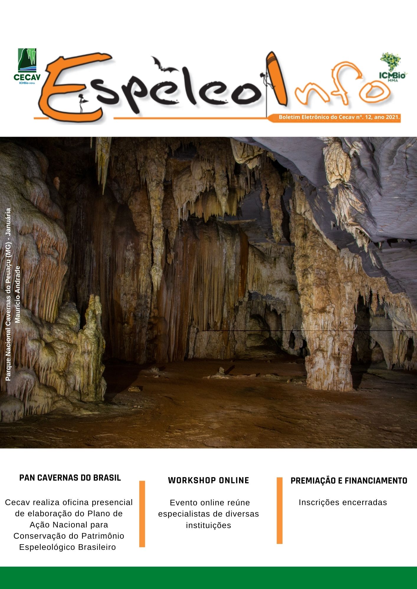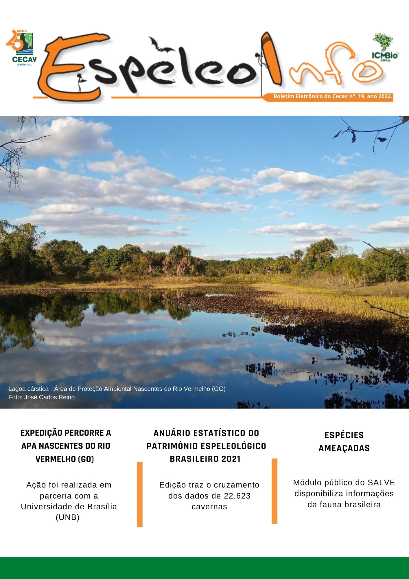 O Centro Nacional de Pesquisa e Conservação de Cavernas (Cecav/ICMBio) está relançando a EspeleoInfo, uma revista digital que tem como objetivo ampliar a divulgação e transparência das atividades do Cecav. O material é direcionado a pesquisadores, estudantes, grupos de espeleologia, espeleólogos e pessoas relacionadas à agenda de proteção e conservação de cavidades naturais subterrâneas. Nesse veículo de publicação mensal, serão divulgadas pesquisas, editais, chamadas de projetos, cursos, eventos e outras atividades relativos à missão institucional do Cecav. Os parceiros e colaboradores estão convidados a compartilhar este espaço.