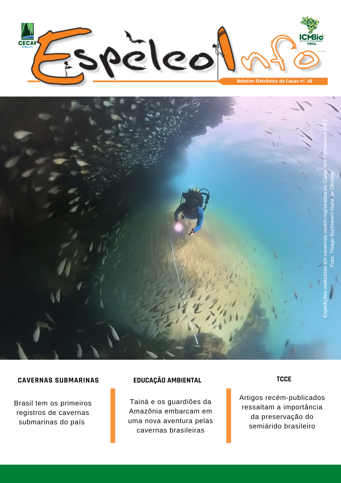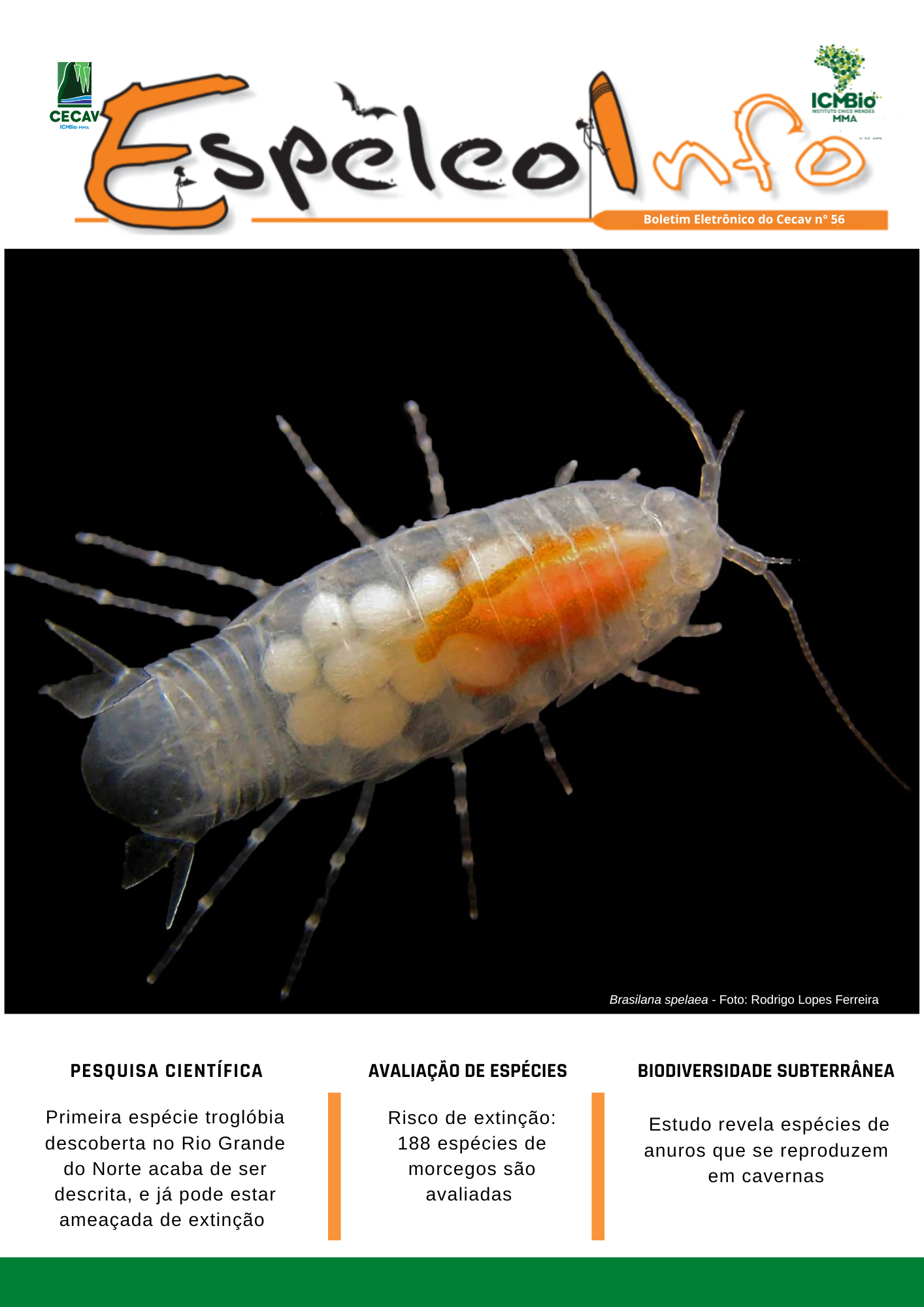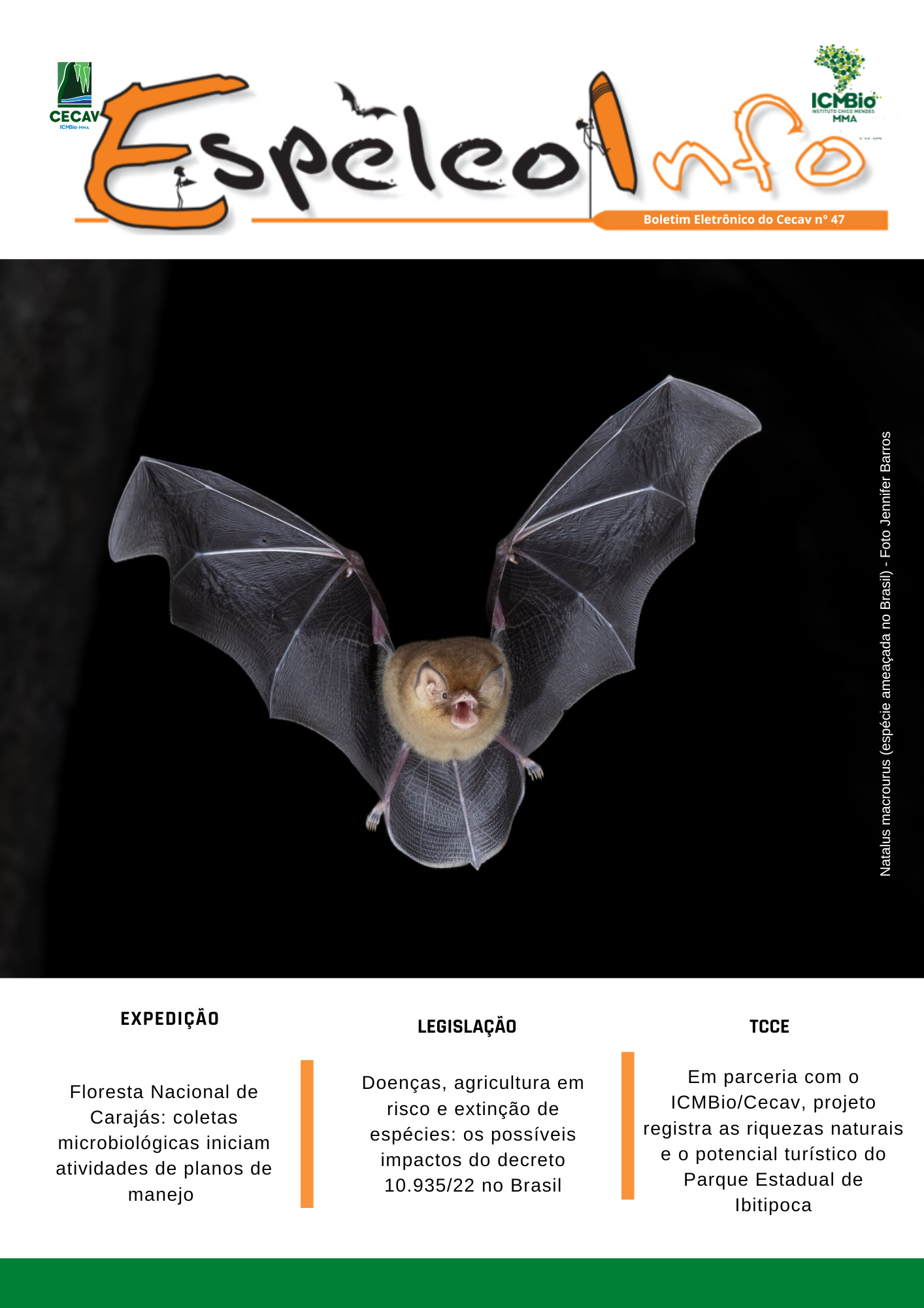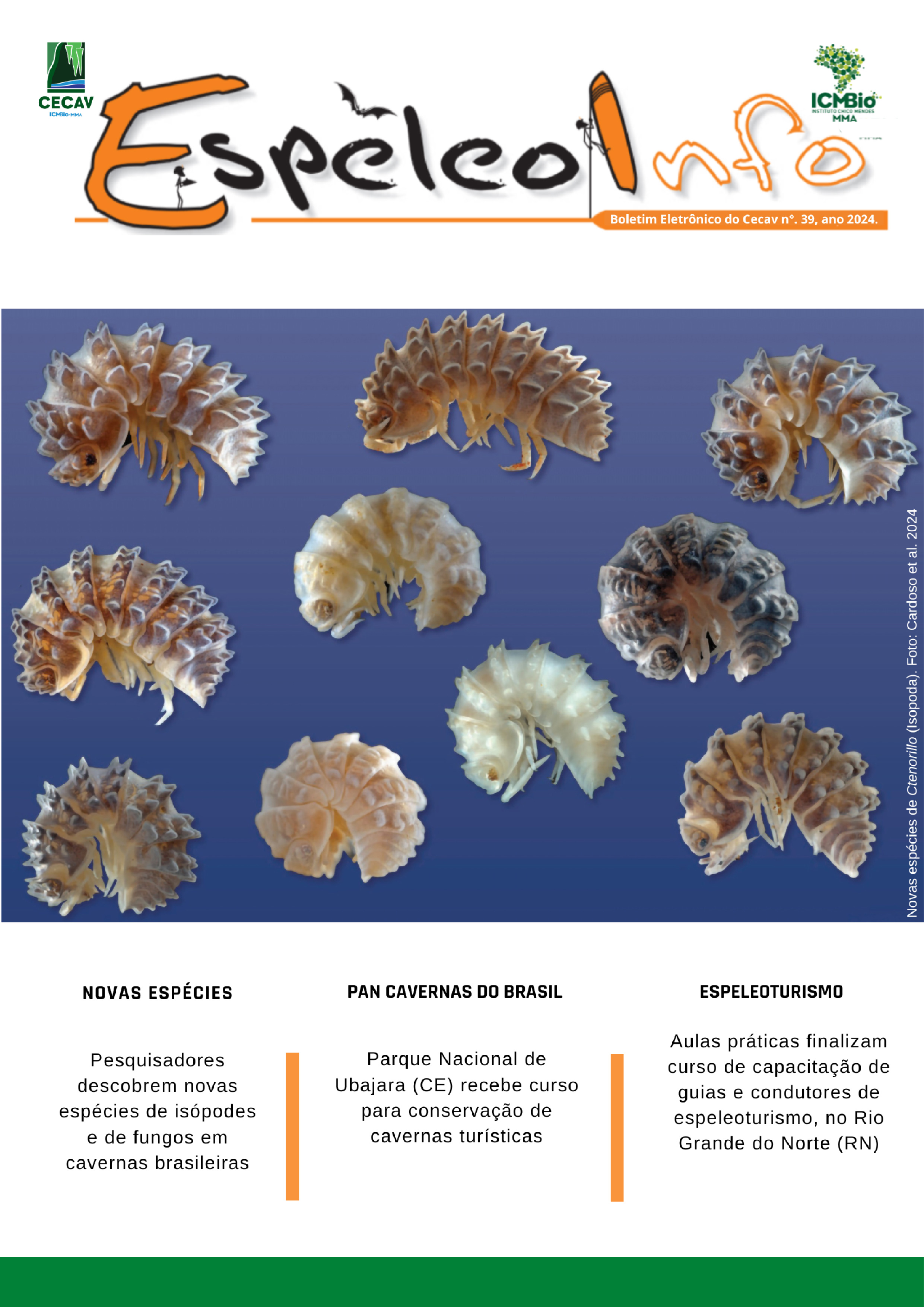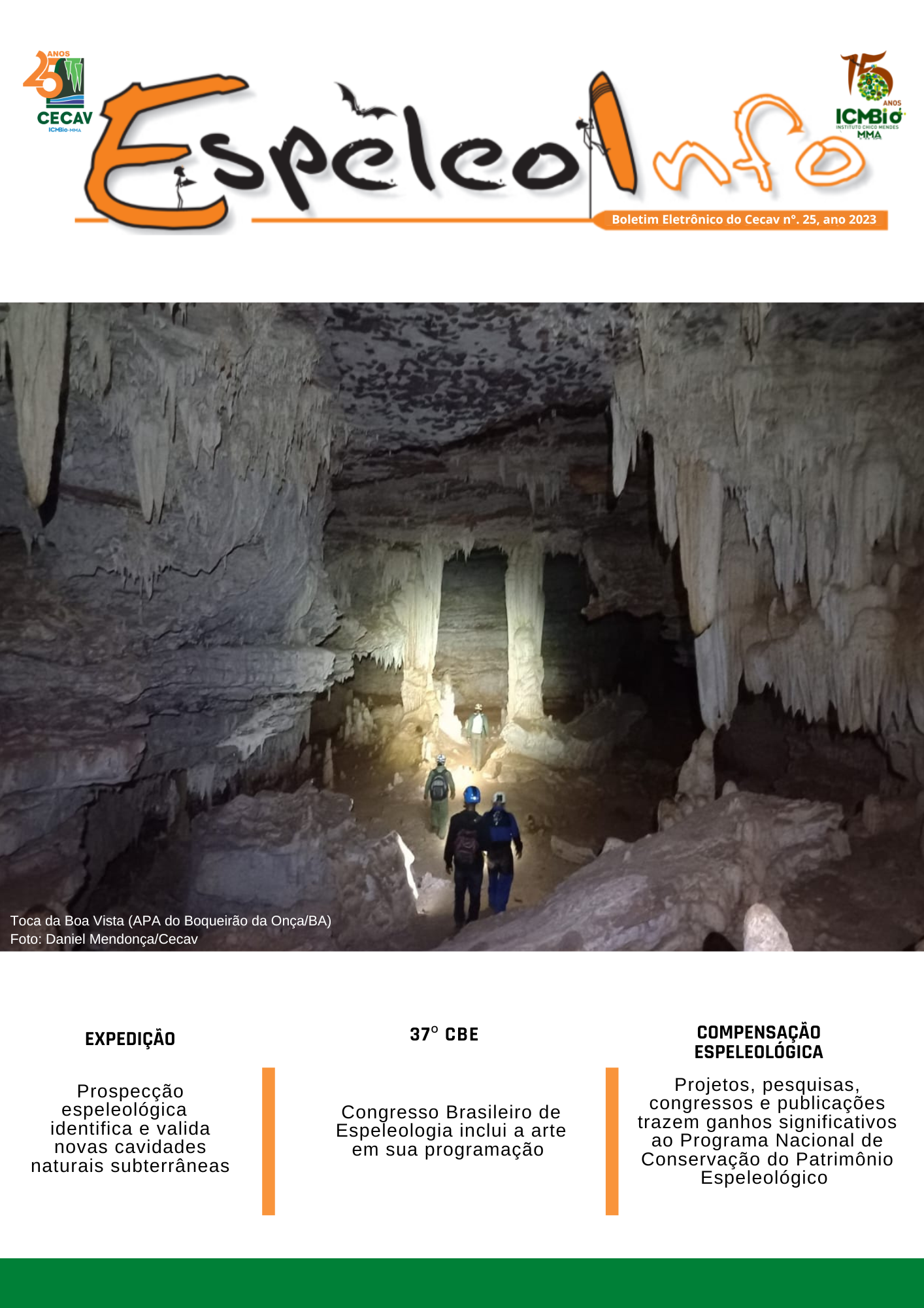 O Centro Nacional de Pesquisa e Conservação de Cavernas (Cecav/ICMBio) está relançando a EspeleoInfo, uma revista digital que tem como objetivo ampliar a divulgação e transparência das atividades do Cecav. O material é direcionado a pesquisadores, estudantes, grupos de espeleologia, espeleólogos e pessoas relacionadas à agenda de proteção e conservação de cavidades naturais subterrâneas. Nesse veículo de publicação mensal, serão divulgadas pesquisas, editais, chamadas de projetos, cursos, eventos e outras atividades relativos à missão institucional do Cecav. Os parceiros e colaboradores estão convidados a compartilhar este espaço.
