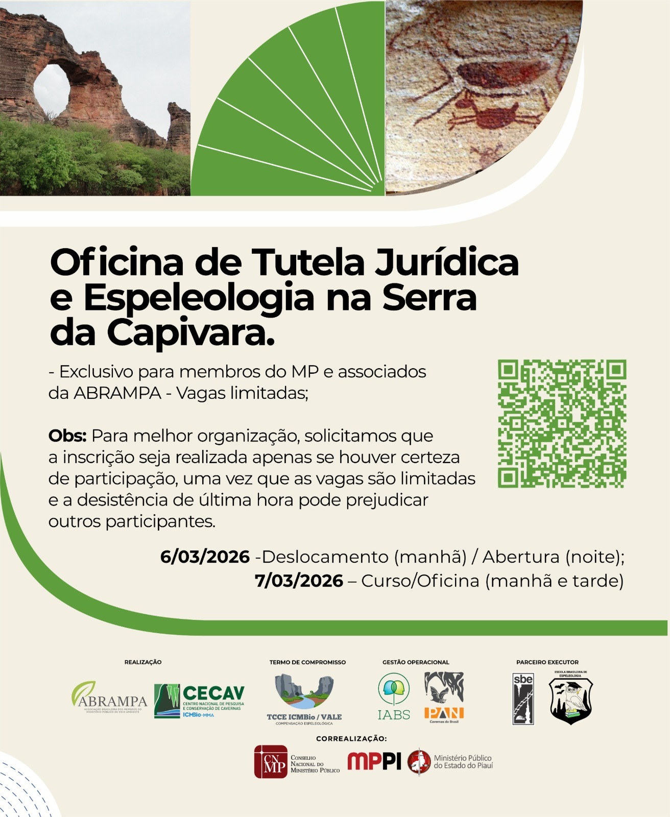 Com o objetivo de ampliar o conhecimento sobre cavernas, biodiversidade subterrânea e as diversas nuances relacionadas à conservação e à proteção desses ambientes naturais, promotores de Justiça poderão participar da Oficina de Tutela Jurídica e Espeleologia, que será realizada no Parque Nacional da Serra da Capivara, em São Raimundo Nonato (PI).Membros do Ministério Público e associados da Associação Brasileira dos Membros do Ministério Público de Meio Ambiente (ABRAMPA) podem se inscrever no evento, que ocorrerá nos dias 6 e 7 de março.