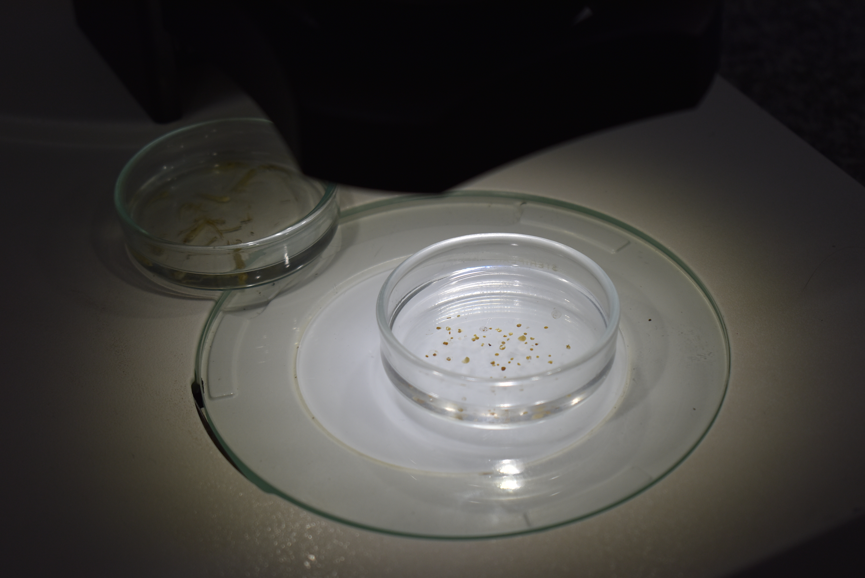 A triagem em laboratório busca identificar ovos e larvas ao nível taxonômico mais específico possível, comparando índices de ocorrência ao longo dos meses de outubro a janeiro, período de cheia do rio.