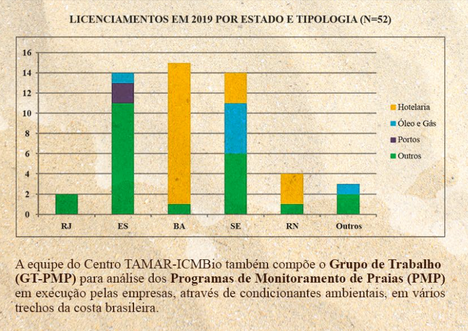 A equipe do Centro TAMAR/ICMBio também compõe o grupo de trabalho (GT-PMP) para análise dos Programas de Monitoramento de Praias (PMP) em execução pelas empresas, através de condicionantes ambientais, em vários trechos da costa brasileira.