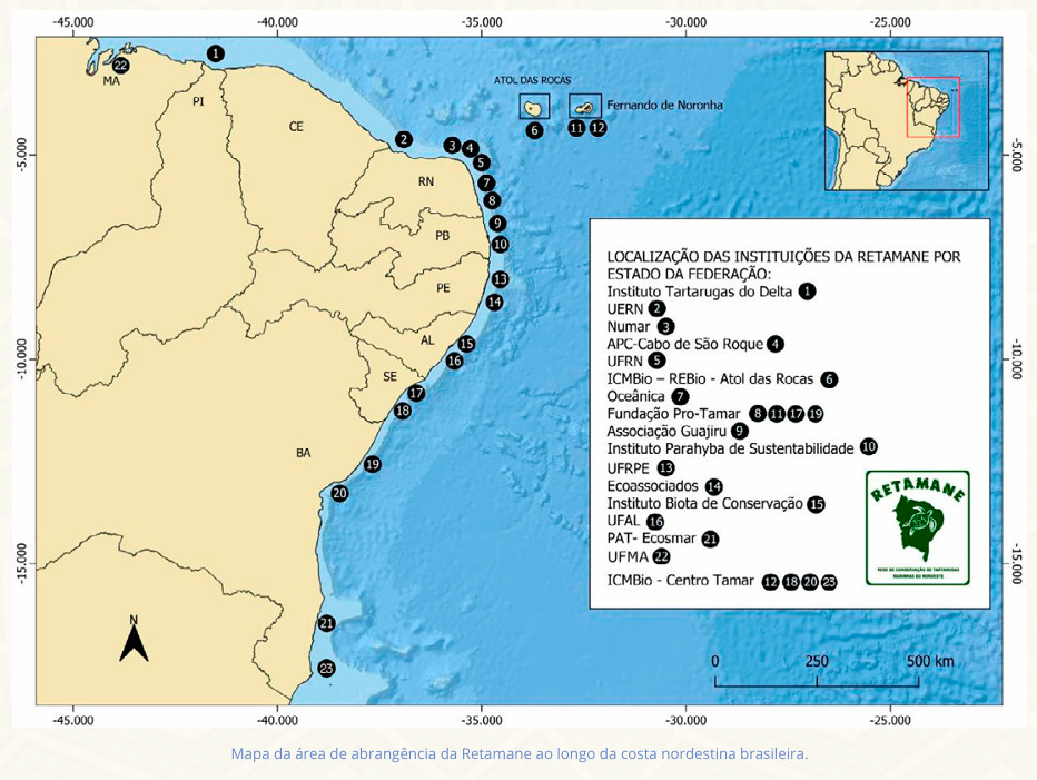 Segundo Bruno, com a exceção de alguns membros, todas as instituições trabalham com manejo reprodutivo e resgate de encalhes. “Contamos na Retamane com ONGs e entidades governamentais, assim detalhadas: ONGs – 1. APC Cabo de São Roque , 2. Associação Guajiru, 3. Ecoassociados, 4. Fundação Projeto TAMAR, 5. Instituto Biota de Conservação, 6. Instituto Tartarugas do Delta, 7. NUMAR, 8. Oceânica, 9. Instituto Parahyba de Sustentabilidade; 10.REBIO Atol das Rocas; e 4 universidades federais (11.UFAL, 12.UFRN, 13.UFRPE e 14.UFMA) e 1 universidade estadual (15.UERN)”, detalha o coordenador científico.