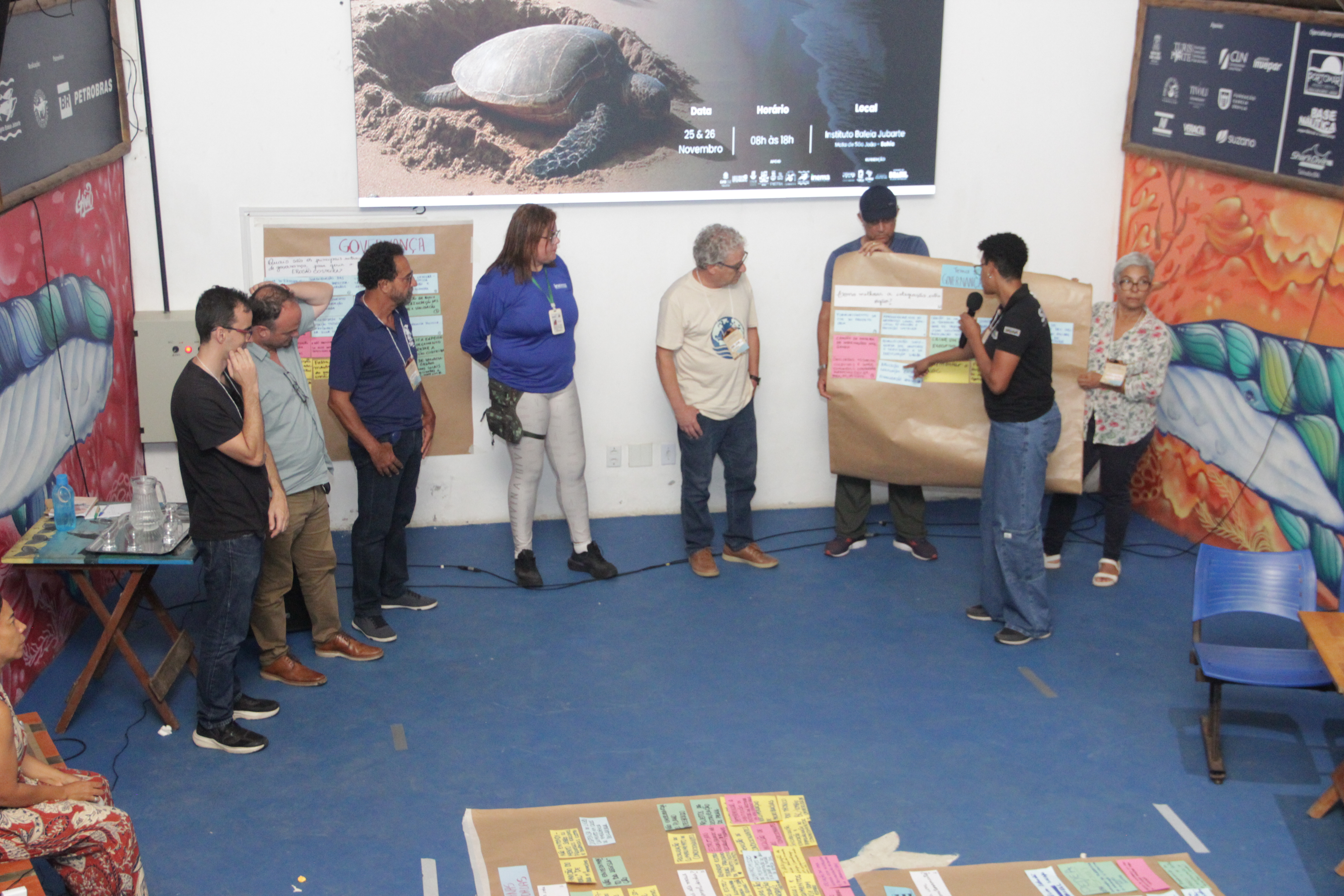 A abertura do dia 26 de novembro ficou a cargo da professora Lirandina Gomes (UNEB), que discutiu os desafios do planejamento territorial, ambiental e urbano no Litoral Norte da Bahia. Em seguida, os participantes se reuniram em uma oficina colaborativa para formular estratégias, recomendações e encaminhamentos voltados à proteção das praias de desova. As propostas envolveram desde ações emergenciais de monitoramento até planos de adaptação baseados em ciência, gestão territorial sustentável e participação comunitária.