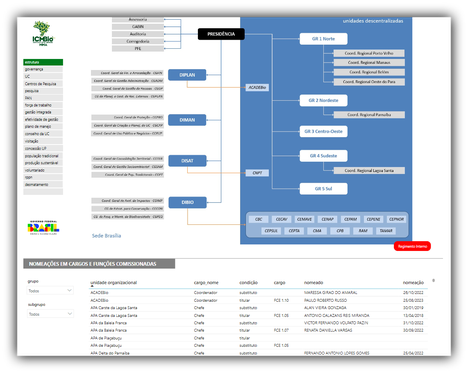 Estão disponíveis d etalhes sobre como funciona a estrutura d o ICMBio , ocupação de cargos, bem como informações sobre unidades de conservação federais, planos de manejo, forças de trabalho, voluntariado, desmatamento, planos de ação para conservação de espécies ameaçadas e populações tradicionais .