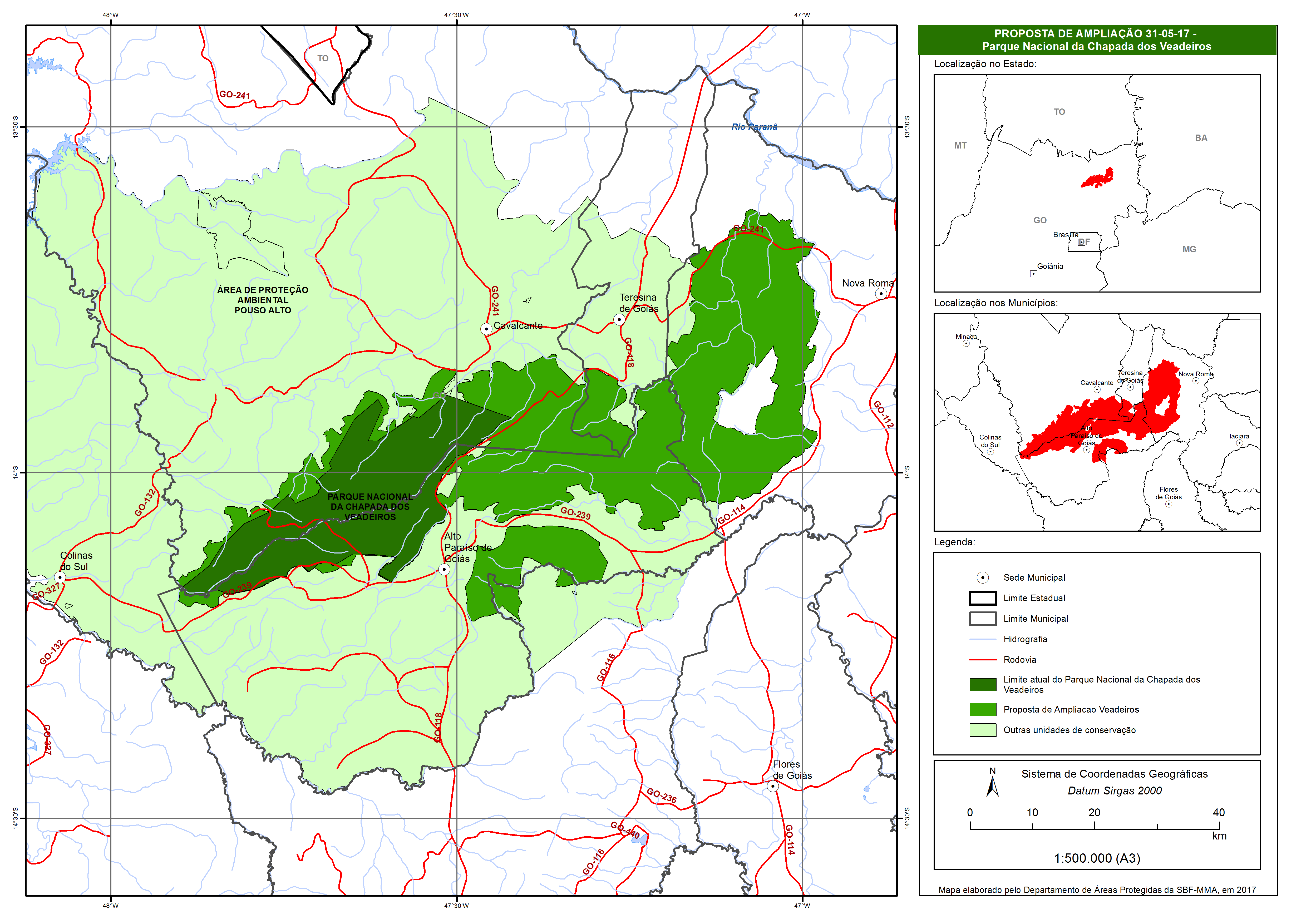 O Parque Nacional da Chapada dos Veadeiros, no nordeste de Goiás, foi ampliado de 65 mil hectares para 240 mil hectares, ou seja, quase quatro vezes o seu tamanho atual. O parque ficará, assim, com duas áreas descontínuas, cortadas pela BR 239 – uma maior, de 222 mil hectares, que engloba a atual poligonal, por onde passa o rio Preto; e outra menor, de 18 mil hectares, que inclui a região do rio dos Macacos. A ampliação consolida, definitivamente, o título de Patrimônio Mundial concedido à unidade de conservação (UC) em 2001 pela Unesco. Veja o mapa