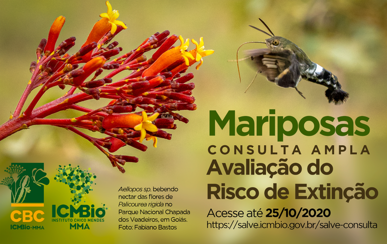 O Instituto Chico Mendes de Conservação da Biodiversidade (ICMBio), através do Centro Nacional de Avaliação da Biodiversidade e de Pesquisa e Conservação do Cerrado (CBC), promove consulta pública para avaliação do risco de extinção de mariposas (Sphingidae: Lepidoptera). Pesquisadores, especialistas e comunidade interessada podem revisar as informações e enviar suas contribuições acessando as fichas base de avaliação aqui (https://salve.icmbio.gov.br/salve-consulta/). Os interessados têm até o dia 25 de outubro para enviar suas contribuições.