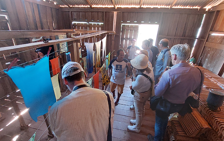 No sábado (20/7) a comitiva da Alemanha visitou a comunidade Jamaraquá, dentro da Flona Tapajós, onde foram apresentados os trabalhos desenvolvidos pelos comunitários com a extração e beneficiamento de látex. Também conheceram as atividades de turismo oferecidas pela comunidade.