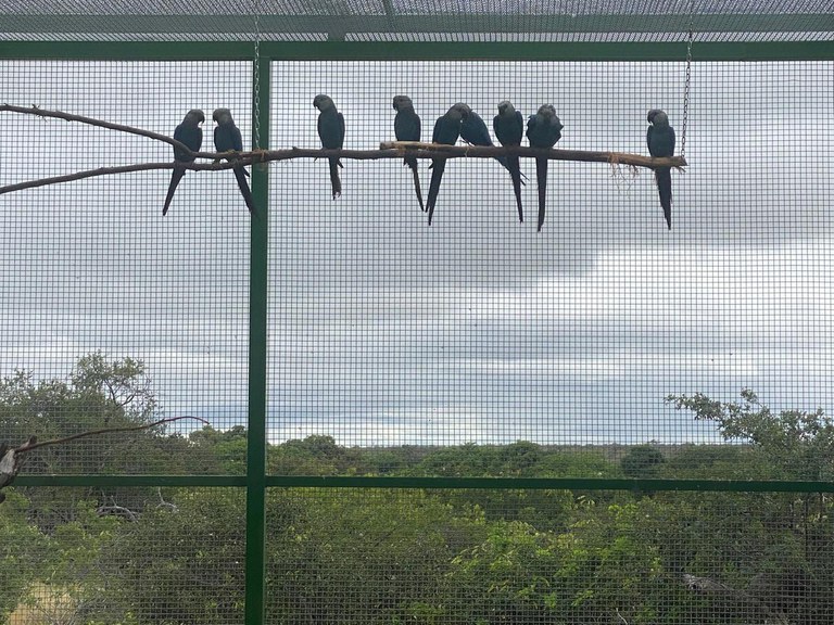 As aves estão em um centro de reprodução na cidade de Curaçá (BA). O recinto foi construído especialmente para manter o acompanhamento das aves até que elas sejam reintroduzidas na natureza, em um futuro próximo. Os aviários possuem dupla camada de proteção, ao passo de permitirem que as aves tenham contato com o clima da Caatinga; essa grade também protege as ararinhas-azuis de outros animais.