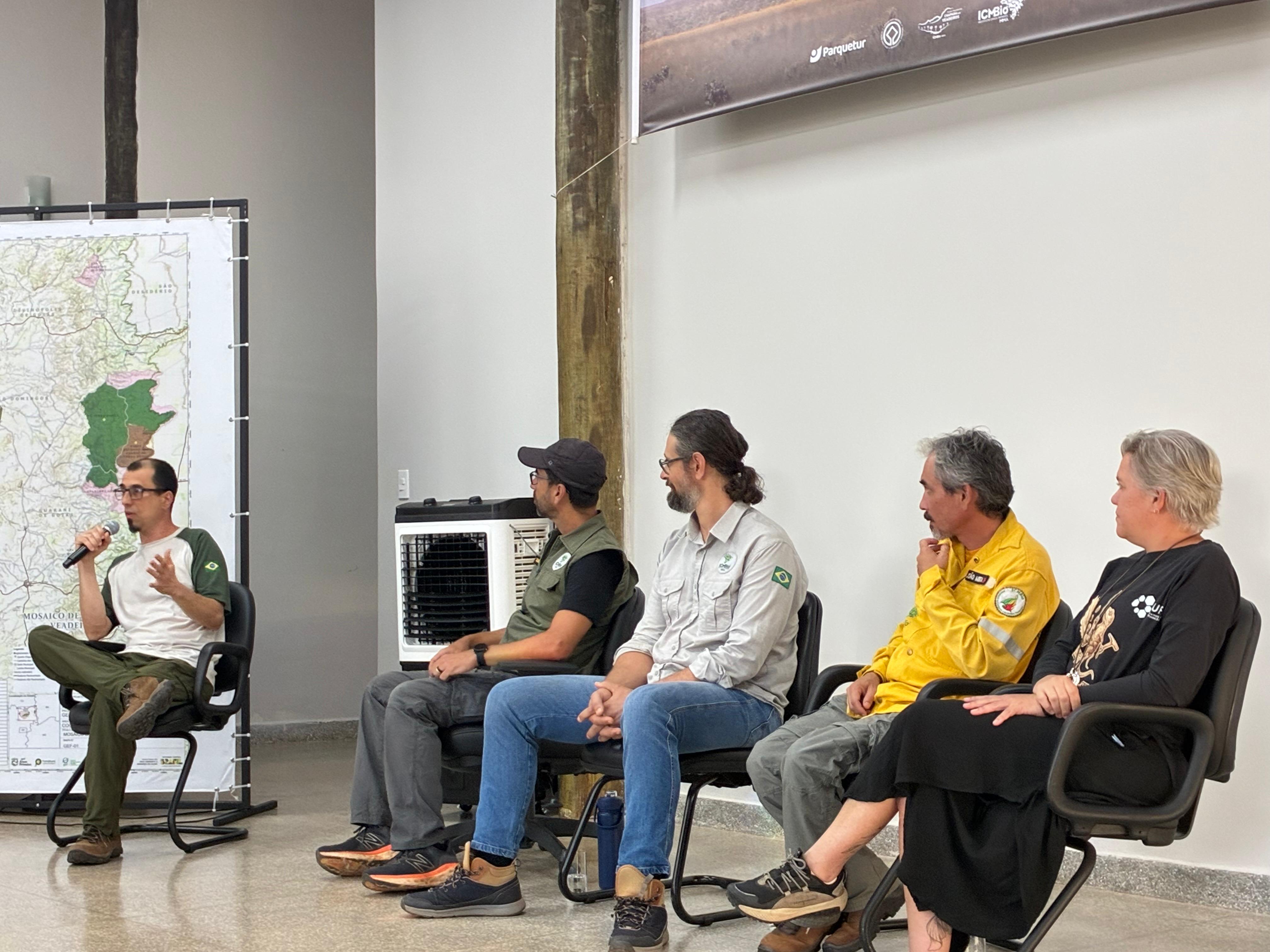 A mesa de encerramento trouxe reflexões técnicas e preocupações com o futuro da unidade. O chefe do parque, André Ribeiro, participou do debate ao lado da geóloga Joana Sanchez e dos colegas de ICMBio, o coordenador de MIF, João Paulo Morita, e de Alexandre Sampaio, coordenador do Centro Nacional de Pesquisa e Conservação em Biodiversidade e Restauração Ecológica (CBC).