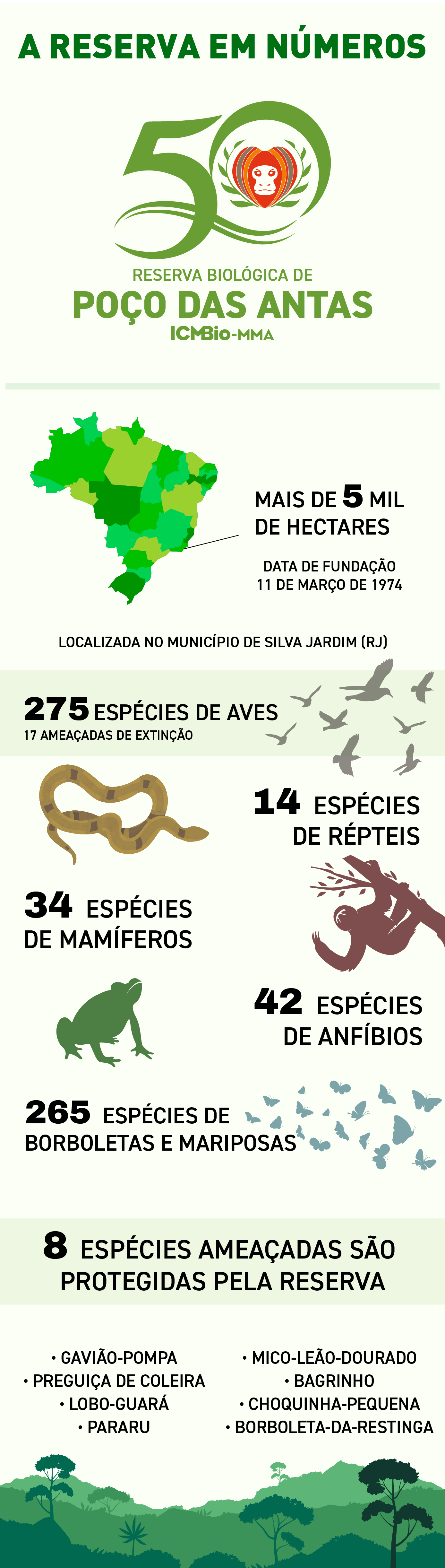 A primeira reserva biológica do Brasil, a Rebio de Poço das Antas, celebra nesta segunda-feira (11/3) o marco de 50 anos de proteção integral de 5 mil hectares de Mata Atlântica no Estado do Rio de Janeiro. A região é o habitat do mico-leão-dourado, primata endêmico ameaçado de extinção e símbolo da luta pela preservação da reserva e do bioma. Outras sete espécies ameaçadas são protegidas pela unidade, administrada pelo Instituto Chico Mendes de Conservação da Biodiversidade (ICMBio).