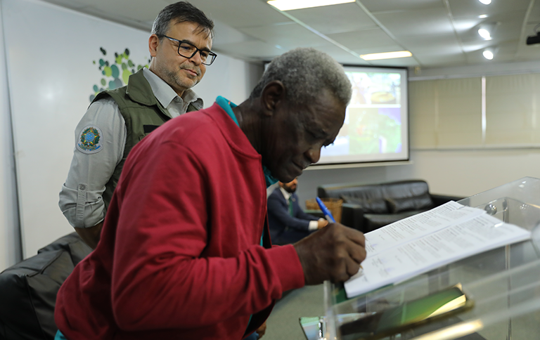 Foi assinado na tarde de quinta-feira (29) o Termo de Compromisso entre o Instituto Chico Mendes, órgão gestor da Reserva Biológica do Rio Trombetas, e a Associação Mãe Domingas (AMD), representante das comunidades do Território Quilombola Alto Trombetas 1(AT1). O termo acordado entre as partes possibilita o uso múltiplo de recursos, mediante regras a serem construídas coletivamente que garantam a proteção ao meio ambiente e o uso sustentável dos recursos pelos quilombolas na área em que o AT1 ficou sobreposto pela Reserva Biológica, criada em 1979. A cerimônia ocorreu no Auditório Rômulo Mello, na sede do ICMBio, em meio às celebrações dos 17 anos do instituto.