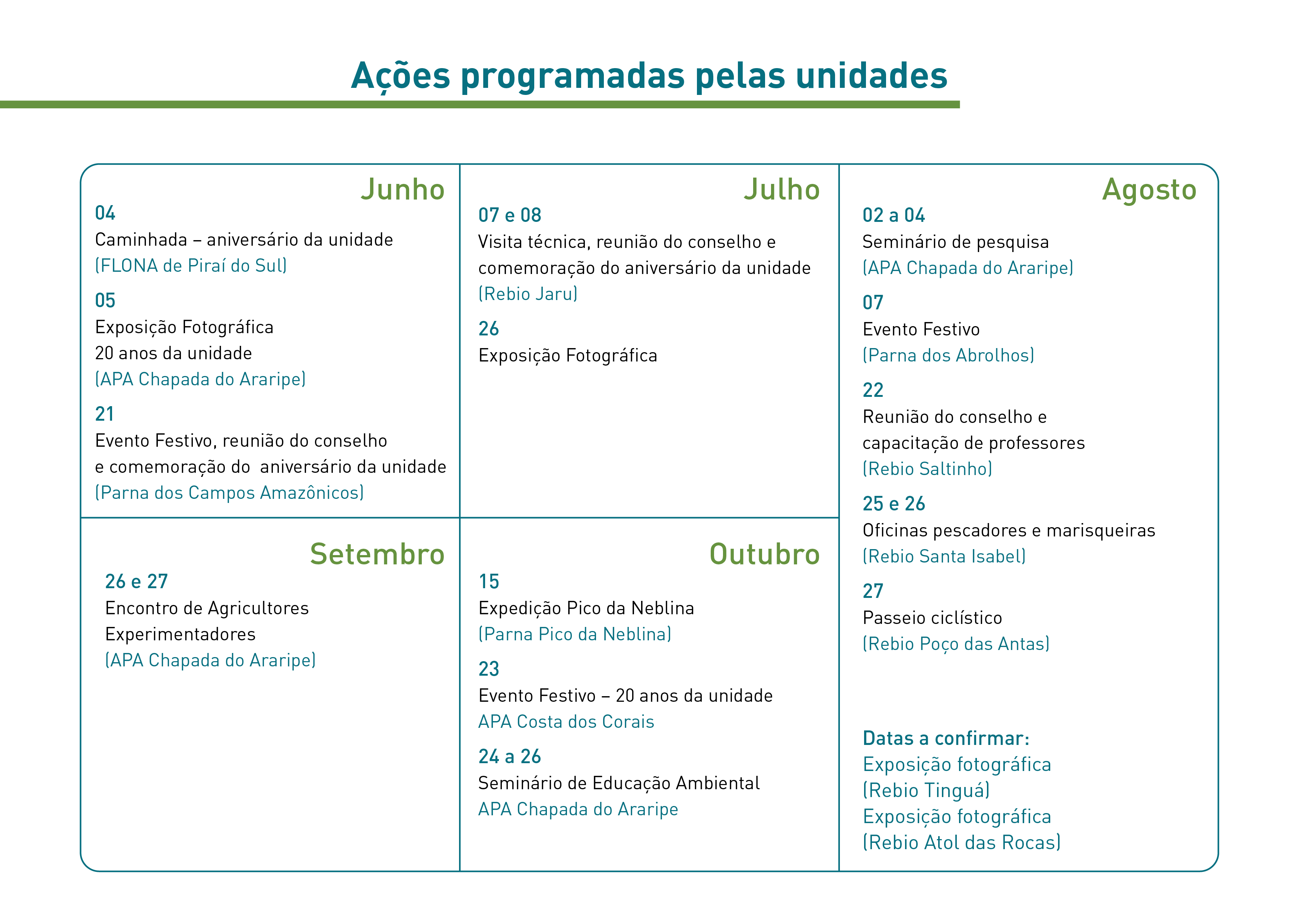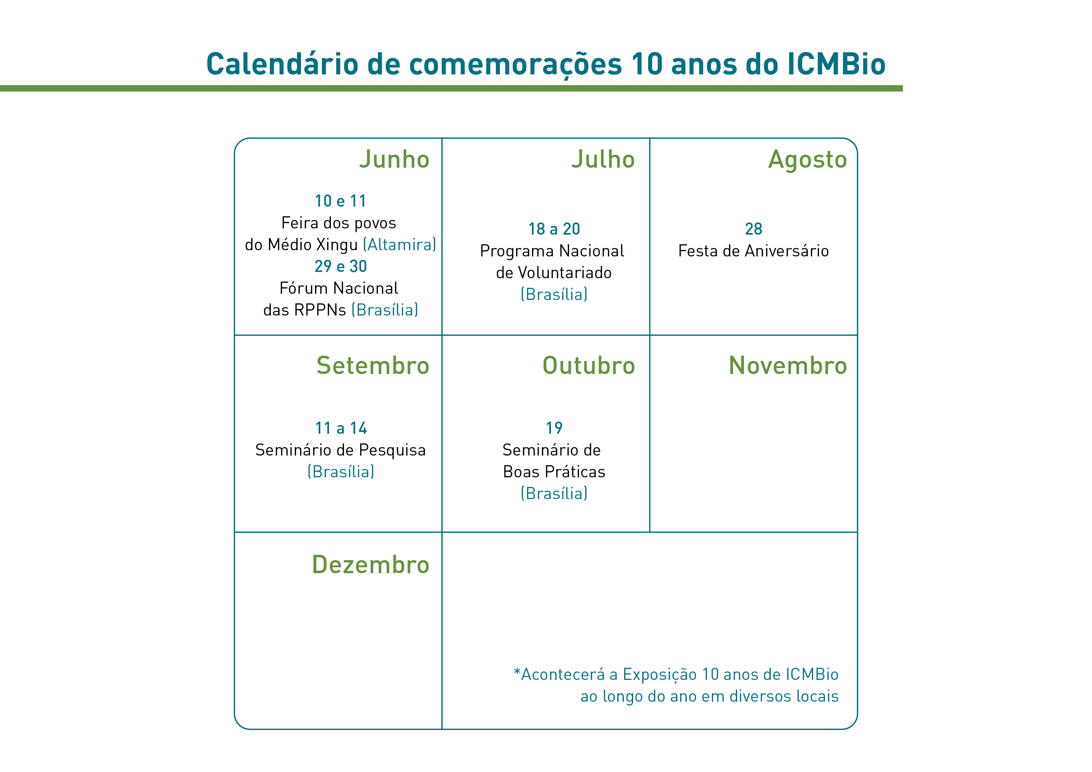 O Instituto Chico Mendes de Conservação da Biodiversidade (ICMBio) comemora em 2017 dez anos de criação. As festividades, que já começaram e vão se estender ao longo do ano, ocorrem na sede, em Brasília, e nas unidades descentralizadas em todo o País. Além de eventos solenes, estão programadas atividades como o projeto "10 Picos, 10 travessias", que prevê a realização de trilhas e subidas em picos em unidades de conservação (UCs), e o Fórum Nacional de Reservas Particulares do Patrimônio Natural (RPPNs). O ponto alto da celebração é o dia 28 de agosto, quando o Instituto faz aniversário.