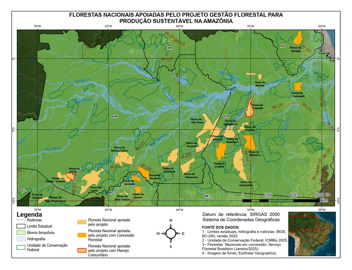 O Projeto apoiou a implementação da Lei de Gestão de Florestas Públicas – Lei 11.284/2006, na região de influência do Distrito Florestal Sustentável (DFS) da BR-163 e na região Purus-Madeira. Teve o objetivo de promover o desenvolvimento socioeconômico e a conservação da Amazônia Legal, com foco na categoria de Unidade de Conservação (UC) de Uso Sustentável: Florestas Nacionais (FLONA). Sua ação abrangeu 24 Florestas Nacionais na Amazônia Legal, perfazendo um total de 12.235.402 hectares, nos estados de Rondônia, Amazonas, Pará, Acre e Amapá.