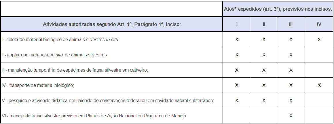 A nova Portaria ICMBio 748/2022, que normativa o uso e a gestão do Sistema de Autorização e Informação em Biodiversidade - Sisbio, trouxe atualizações e aprimoramentos buscando deixar claro o funcionamento dos critérios e dos processos autorizativos do sistema. Uma das mudanças foi no artigo 3°, no qual a atual Portaria esclarece que as autorizações das atividades do art. 1° se dão por meio da emissão de quatro tipos de atos administrativos e cada ato pode autorizar um ou mais subconjuntos de atividades. Segue abaixo um quadro da associação dos atos com as atividades autorizadas.