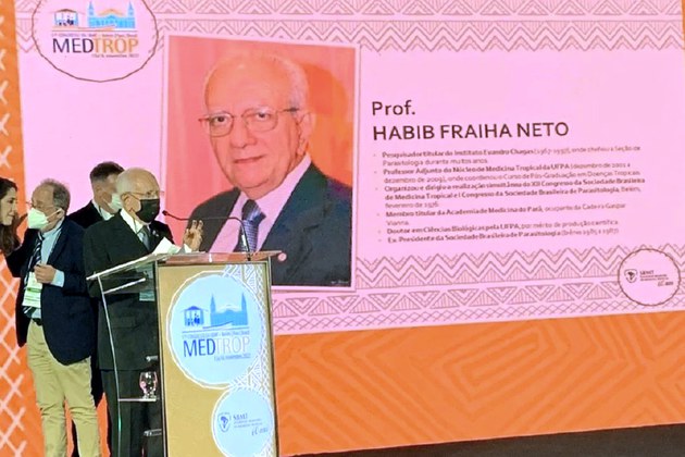Durante a cerimônia de abertura, no dia 13, a Sociedade Brasileira de Medicina Tropical (SBMT) premiou o Dr. Habib Fraiha Neto com a Medalha do Mérito Científico Carlos Chagas. A honraria é concedida ao pesquisador com excepcional produção científica na área de Medicina Tropical, que tenha desenvolvido significante contribuição científica em sua trajetória de pesquisador em instituições do Brasil, que tenha tido importante papel na formação de recursos humanos em Medicina Tropical (stricto sensu e lato sensu), entre outros critérios. O Dr. Habib atuou como pesquisador no Instituto Evandro Chagas, onde chefiou a Seção de Parasitologia durante muitos anos; foi professor adjunto do Núcleo de Medicina Tropical da UFPA e atualmente é membro titular da Academia de Medicina do Pará (AMP). Ele disse ter ficado surpreso com a premiação. “Esse foi o Prêmio de Pesquisador Sênior do ano 2022, portanto o maior prêmio concedido pela SBMT, o que me enche do mais legítimo orgulho, mas que eu recebo com muita humildade, como um presente dos céus. Agora, essa escolha me pegou de surpresa porque estou aposentado desde 2009. Não é que eu esteja inativo, pois estou escrevendo muito. Como membro da AMP, estou biografando os membros da Academia, tanto os titulares como os seus patronos e os membros honorários, uma missão que me proponho e que é um autêntico desafio porque já estou com 83 anos de idade. Então, eu estou muito vaidoso e muito agradecido à SBMT por esta escolha altamente honrosa”, afirmou o pesquisador, que já perdeu a conta de quantos eventos do Medtrop já participou. “Eu promovi em Belém o 12º Congresso da Sociedade Brasileira de Medicina Tropical, simultaneamente com o primeiro da Sociedade Brasileira de Parasitologia, que eu viria até a ser o presidente. Então, eu tenho uma história com esses eventos”, concluiu.