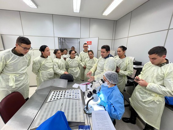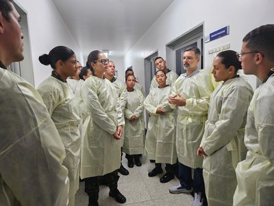 Um grupo formado por 23 oficiais alunos e quatro oficiais instrutores da Escola de Saúde e Formação Complementar do Exército (ESFCEx) visitou o campus do Instituto Evandro Chagas (IEC/SVSA/MS) em Ananindeua, na região metropolitana de Belém. O Pedido de Cooperação de Instrução (PCI) feito pelo Coronel André Sodré Lira Brandão, comandante da ESFCEx, teve como finalidade melhorar a formação e capacitação do recursos humanos na área de saúde, conhecer o ambiente operacional amazônico e compreender a atuação do Serviço de Saúde nessa região.