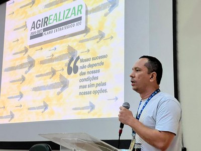 O servidor da área de Comunicação Social do SEGAD/IEC, Fábio Bastos, apresentou a nova identidade visual do Planejamento Estratégico do IEC para o Ciclo 2024-2027. "O conceito de 'agir e realizar' é justamente fazer acontecer. Toda a identidade visual se refere a posicionar a comunidade do IEC para perseguir os mesmos objetivos, como definido no plano." explicou o servidor.