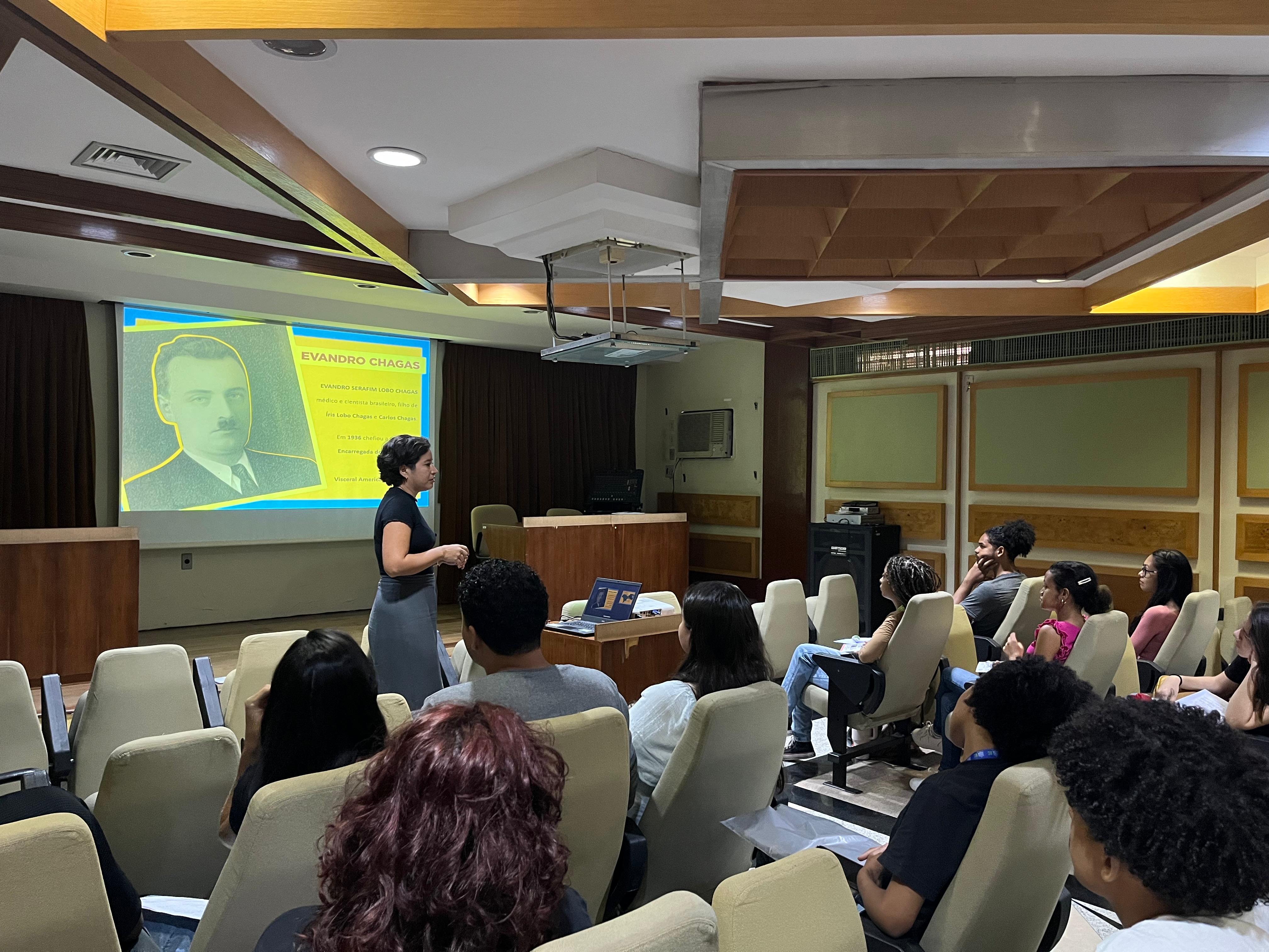 - Clarissa Santos, técnica do Museu (MEV/SEVMI), palestrando sobre a história do Instituto EVANDRO Chagas