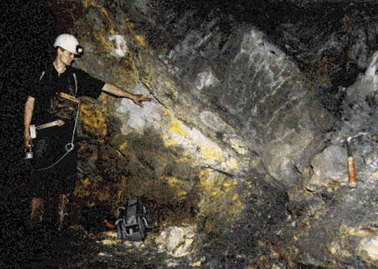 Vista da mina de Oklo, situada no Gabão (África Ocidental). Ali, há cerca de dois bilhões de anos, um reator nuclear de fissão esteve ativo. Os veios amarelos que aparecem na foto são o minério de urânio. - Foto: Robert D. Loss