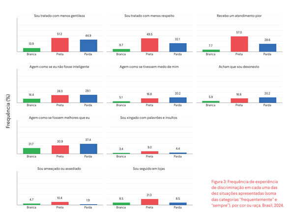 Esta é a primeira vez que uma pesquisa nacional mapeia a frequência com que brasileiros se sentem discriminados em atividades do dia a dia e quais são as razões atribuídas a essas situações de discriminação. A partir da aplicação da Escala de Discriminação Cotidiana, o estudo levantou dados sobre as experiências de discriminação em diferentes situações e evidenciou que a raça é o principal fator de discriminação no país, com 84% dos entrevistados que se identificam como pretos relatando já ter sofrido discriminação racial.
