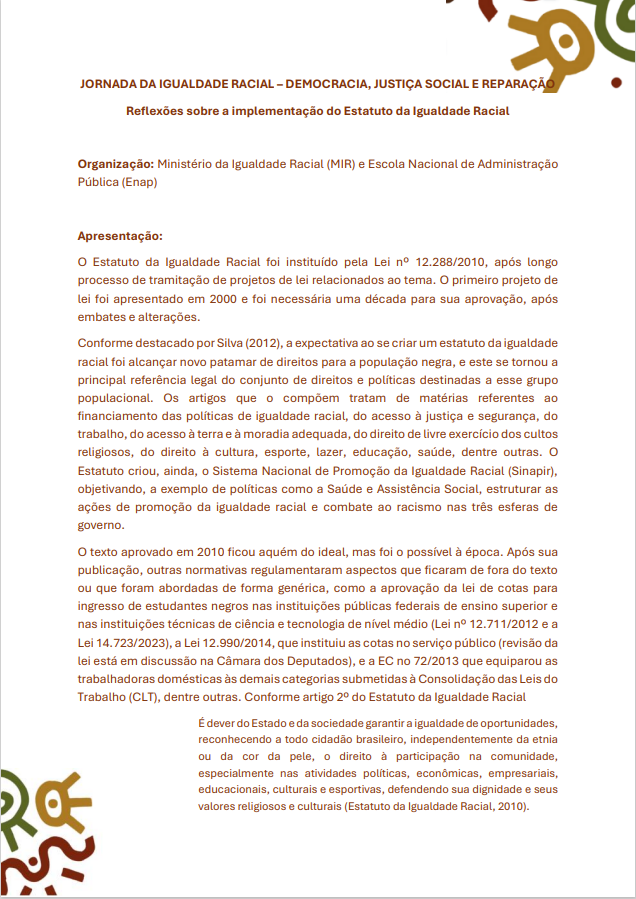 | Jornada da Igualdade Racial - Democracia, Justiça e Reparação: Reflexões sobre a implementação do Estatuto da Igualdade Racial | Este documento descreve a "Jornada da Igualdade Racial" organizada pelo MIR e Enap, com foco em avaliar o Estatuto da Igualdade Racial e discutir avanços e desafios na promoção da igualdade racial no Brasil. O evento, que ocorre em novembro de 2024, reunirá servidores, pesquisadores e sociedade civil para debater áreas como justiça, trabalho e educação, visando contribuir para a V Conferência Nacional de Promoção da Igualdade Racial em 2025. | |
