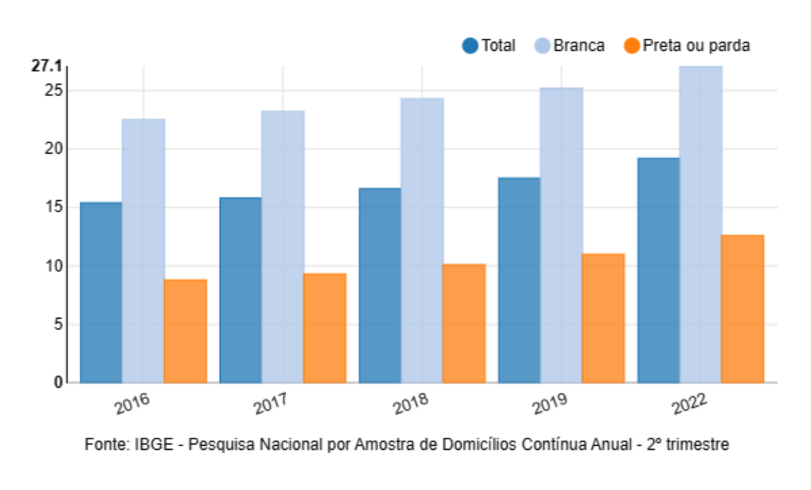 Em 2022, 27,1% das pessoas brancas com 25 ou mais anos haviam alcançado o ensino superior completo. Esta era a realidade para apenas 12,6% das pessoas negras.