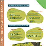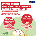 Evitar carnes processadas e limitar carnes vermelhas são formas de se proteger do câncerInfográfico sobre o que são carnes processadas e porquê limitar seu consumo é uma forma de se proteger do câncer. | |