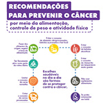 Recomendações para prevenir o câncer por meio da alimentação, controle de peso e atividade físicaInfográfico sobre as recomendações do INCA para prevenir o câncer por meio da alimentação, controle de peso e atividade física |