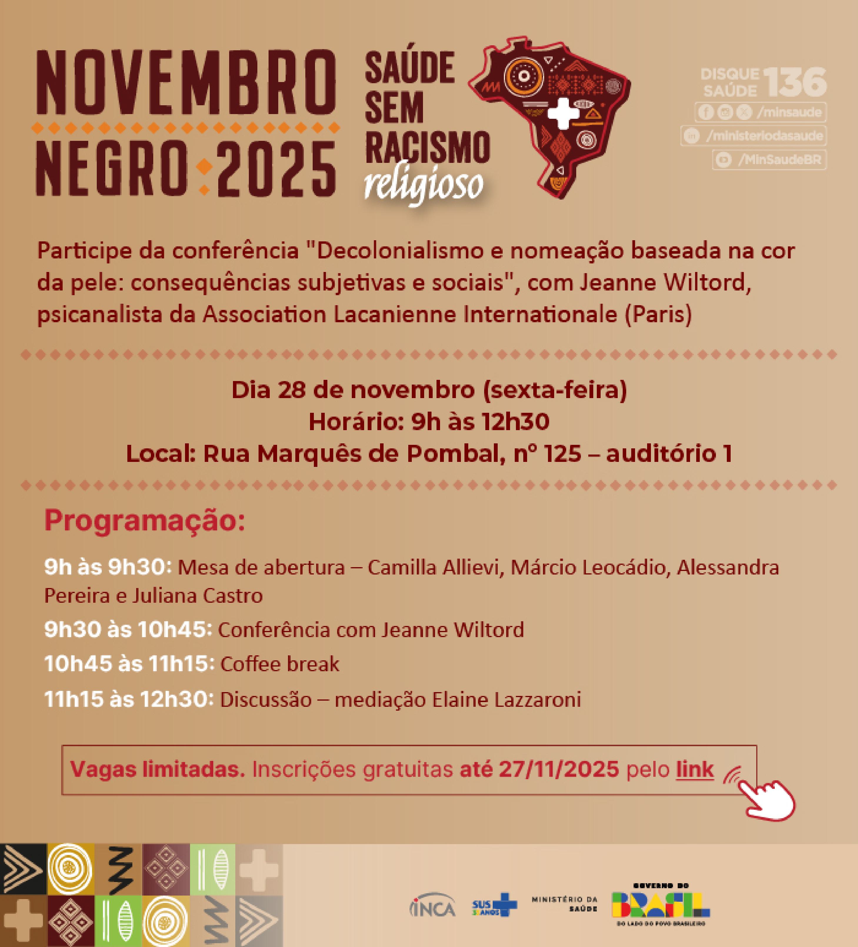 Participe da conferência "Decolonialismo e nomeação baseada na cor da pele: consequências subjetivas e sociais" com Jeanne Wiltord, psicanalista Association Lacanienne Internationale (Paris).