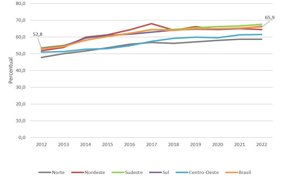 Figura 1. Proporção de mamografias de rastreamento de 50 a 69 anos em relação a todas as mamografias de rastreamento, por regiões (Brasil), de 2012 a 2022