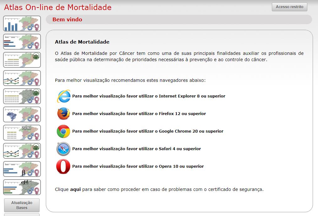 O Atlas de Mortalidade gera, a partir das informações disponibilizadas pelo Sistema de Informações sobre Mortalidade (SIM), do Ministério da Saúde, indicadores para a mortalidade por câncer sob o formato de tabelas, gráficos e mapas.