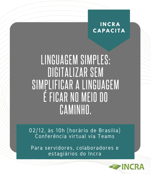 Descrição: A palestra tem como objetivo incentivar a produção de documentos oficiais e informações ao público com linguagem simples e de fácil entendimento por parte dos usuários de serviços do Incra. Pretende estimular a produção de informações com objetividade, clareza, empatia e simplicidade. E ainda incentivar a produção de textos na ordem direta, com frases curtas e sem tecnicismo.