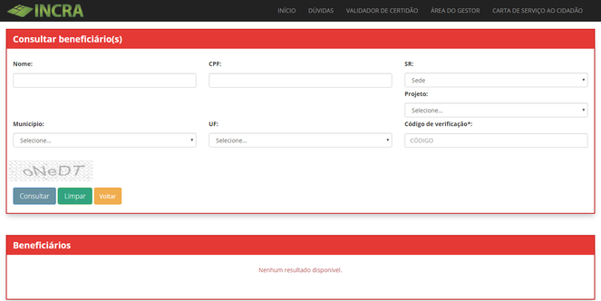 As informações veiculadas nesta seção do portal do Incra são destinadas ao público em geral para fins de pesquisa e controle social da relação de famílias homologadas como beneficiárias do Programa Nacional de Reforma Agrária.