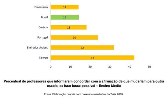Ensino médio – Entre os professores brasileiros do ensino médio, a proporção dos que manifestaram que mudariam de escola, se possível, também é baixo. O percentual do Brasil (14%) se iguala ao da Dinamarca e ambos estão bem distantes de Taiwan, que apresentaram o maior percentual de professores que informaram que mudariam para outra escola se pudessem (42%).