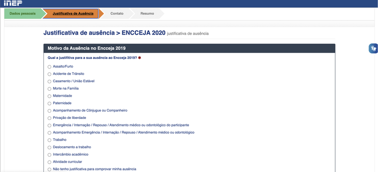 Após a conferência dos dados pessoais, clique em “Próximo” para que seja apresentada a próxima tela e, então, selecione o motivo da ausência no Encceja 2019, a partir das opções apresentadas.