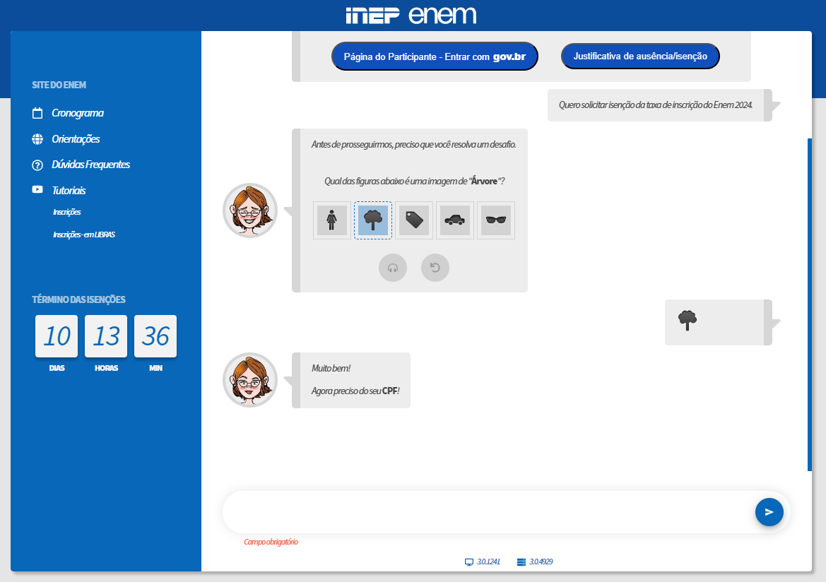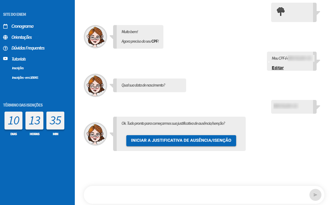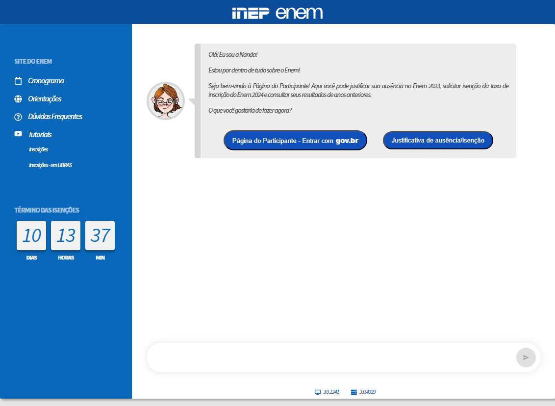 A justificativa de ausência é para o participante que conseguiu a isenção da taxa de inscrição no Enem 2023, mas faltou aos dois dias de aplicação e deseja pedir isenção na edição de 2024. O resultado da solicitação de isenção da taxa de inscrição no Enem será divulgado no dia 13 de maio. O período de recursos para quem teve o pedido negado será de 13 a 17 de maio.