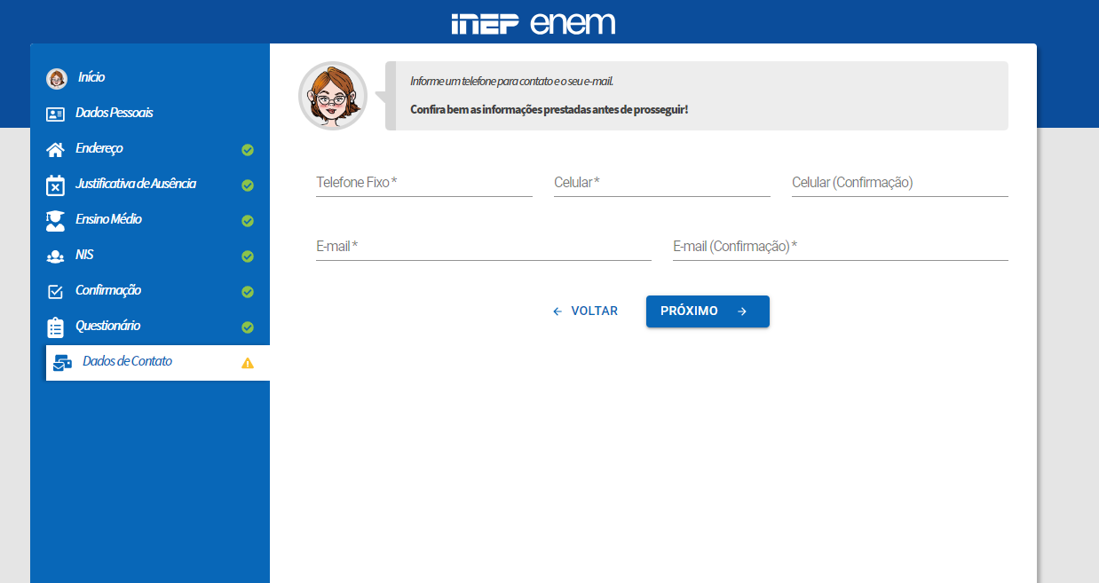 10. Após responder ao questionário e confirmar as respostas, informe os dados solicitados (telefone, celular e e-mail).